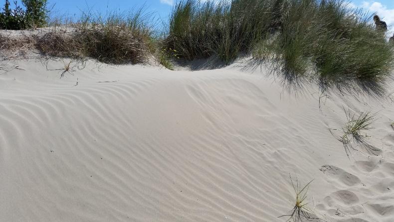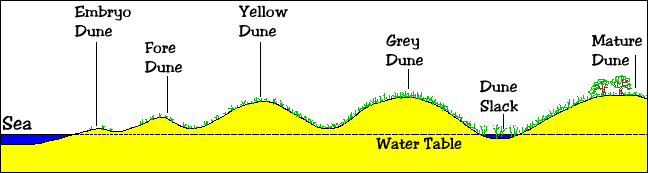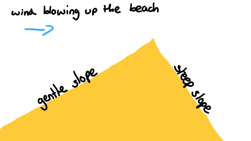 This explains some of the features of dunes. The sheltered side of the dune is always steeper, whereas the side that is in the wind has a gentler slope. The further from the beach, the larger that the dunes generally are.