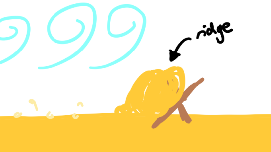 As the wind blows up the beach, it will transport material, including sand backwards, through saltation. This is where it is bounced across the beach’s surface as it is blown backwards. Eventually, the sand will be blown against an obstacle, and the sand will start to pile up, creating a ridge. The side facing the wind will start to reach a crest. This is because the pile of material becomes very steep and unstable and begins to collapse. When this happens, smaller particles will start to fall down the other side of the pile. Once there is a stable angle once again (anywhere between 30-34 degrees), the sand will stop sliding, and it will start to build up again. As the sand becomes an obstacle, it will cause other dunes to form in front of it. Generally, the stronger the wind is, the higher the dunes.