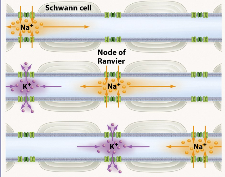 in this way, electrical signals continue to jump (like saltation transportation) down the axon much faster than they can move down an unmyelinated cell