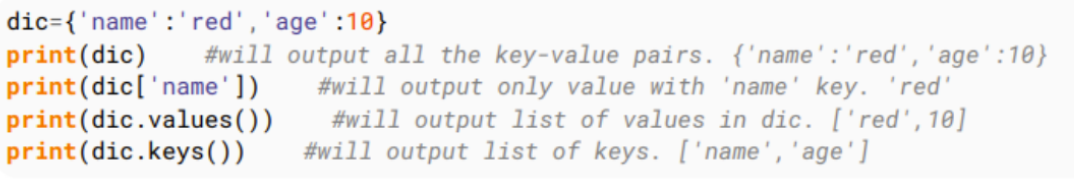 Dictionary consists of key-value pairs. It is enclosed by curly braces { } and values can be assigned and accessed using square brackets [ ]