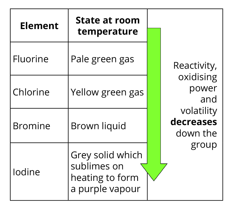 Volatility (tendency to form a gas) and melting point decrease down the group because intermolecular forces strengthen as atoms get bigger.