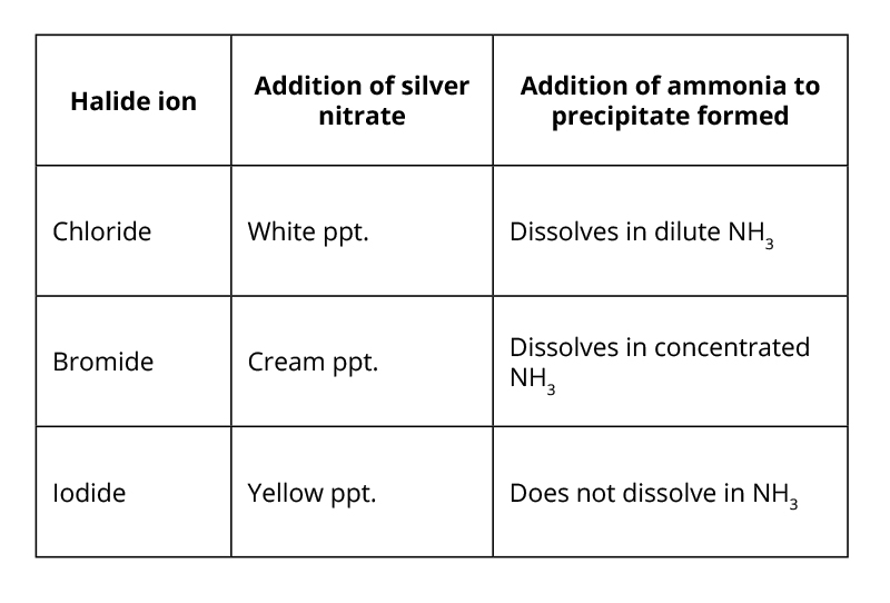 The reaction of halide ions with silver ions in dilute nitric acid is important in qualitative analysis – identifying unknown solutions or solids.