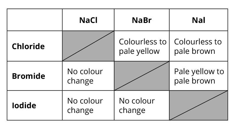 A more reactive halogen will displace a less reactive one from a solution of one its salts.
