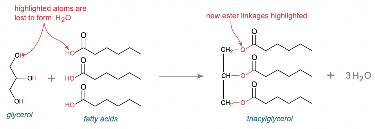 reactants: 3 fatty acids (can be different fatty acids) + 1 glycerol