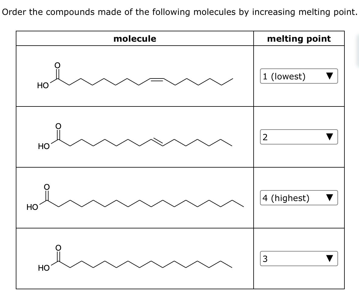 * melting point increases with more carbons in molecule