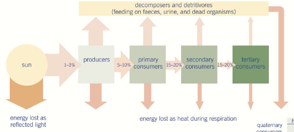 Only around 0.001% of the total energy originally present in the incident sunlight is finally embodied as biomass in a tertiary consumer.