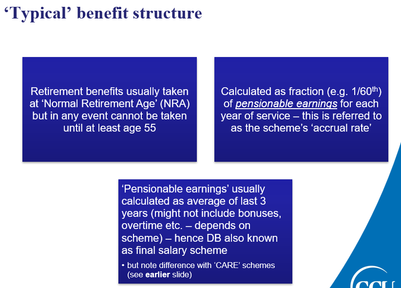 •Normal Retirement Age – the age to which the employer will pay contributions and at which employees will usually retire (although they don’t have to)