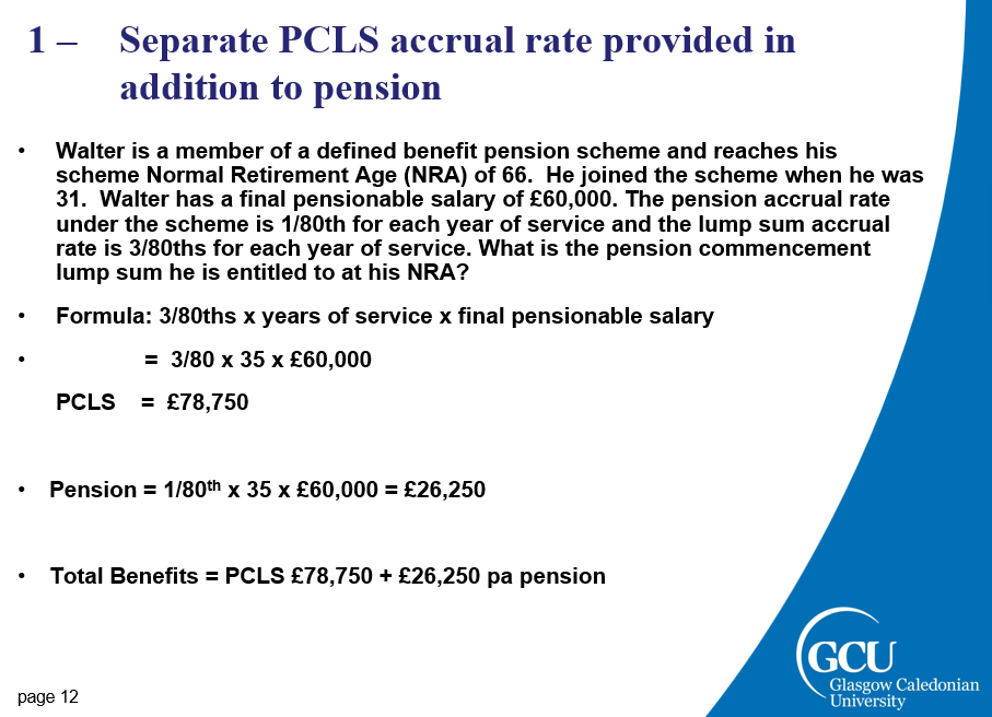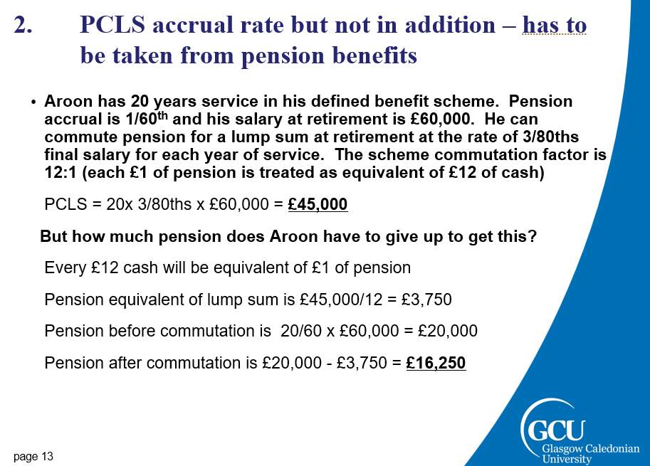 2.Scheme has accrual rate for PCLS e.g. 3N/80ths of final salary. This is not in addition to the pension accrual – you have to ‘cash in’ some of the value of your pension to provide cash lump sum