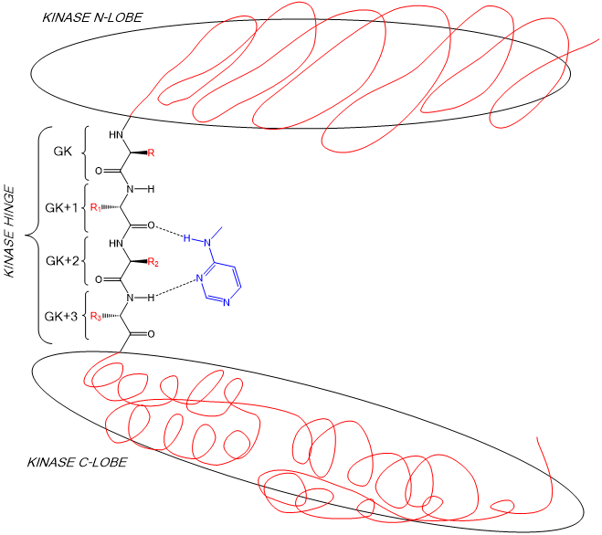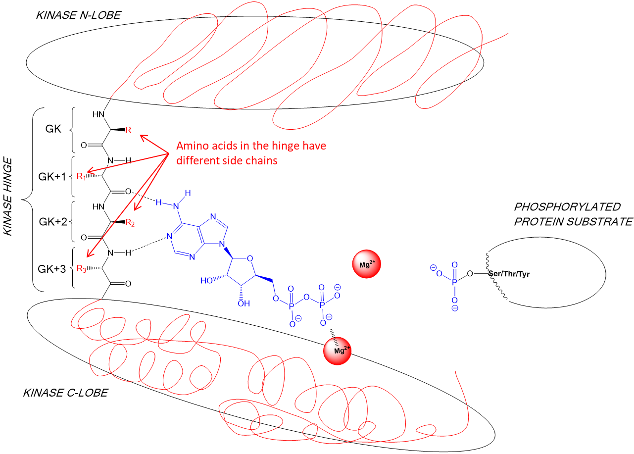 19: the first amino acid in the hinge region at the N lobe of the kinase is known as the gatekeeper (GK residue) as the R side chain is gatekeeper to a potential kinase selectivity pocket - this pocket can be exploited in drug development