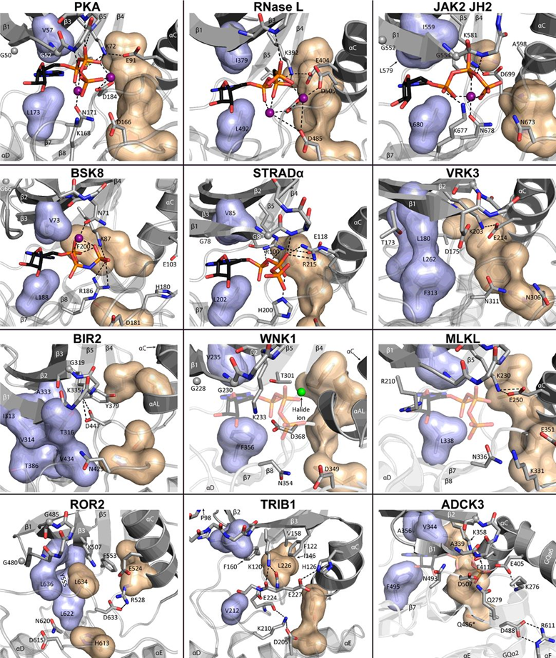 31: If ATP binding sites have different shapes then different molecules can be designed to map onto those different shapes. The surfaces below represent different sized amino acids present in kinase ATP binding sites