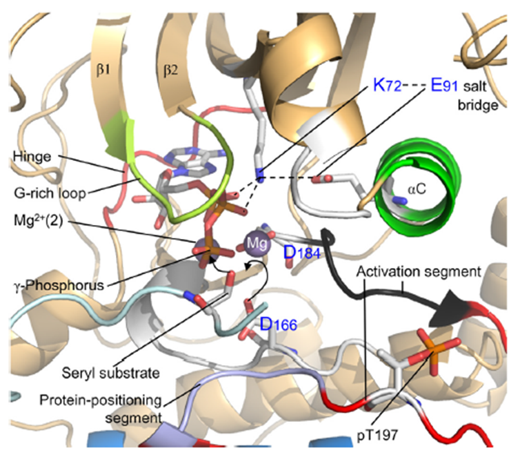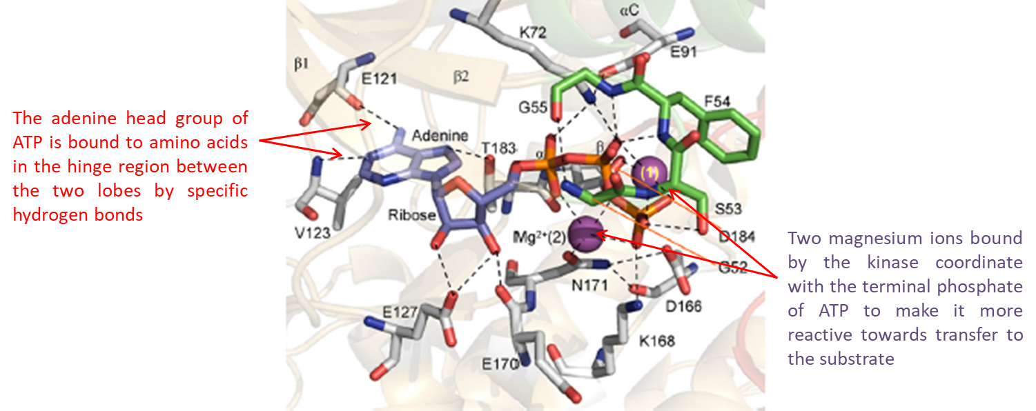 2 Mg ions bound by the kinase coordinate with ATP terminal phosphate to make it more reactive towards transfer to substrate.