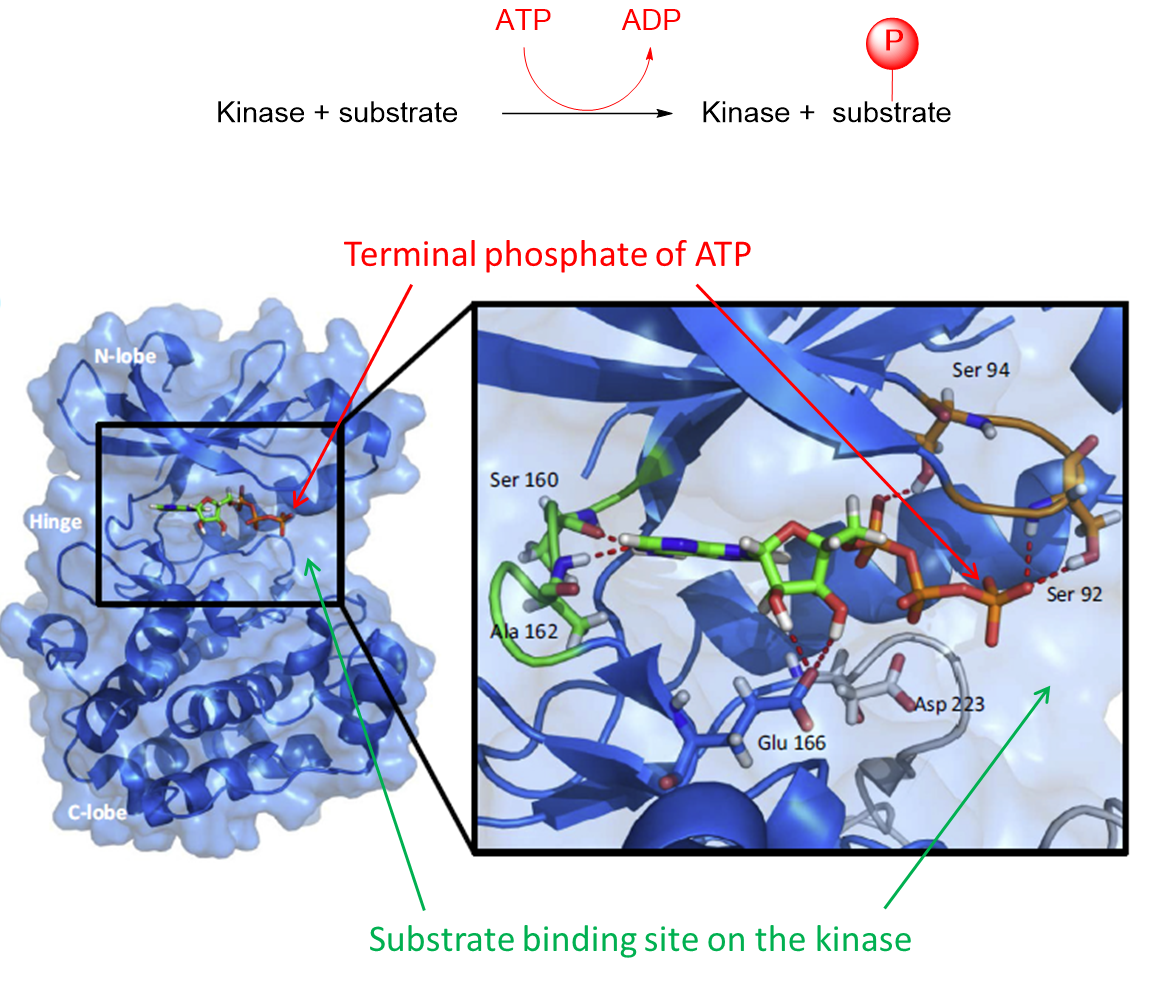 25: We can stop a kinase from transferring phosphate to its substrate by designing a molecule which competes with ATP for the binding site.