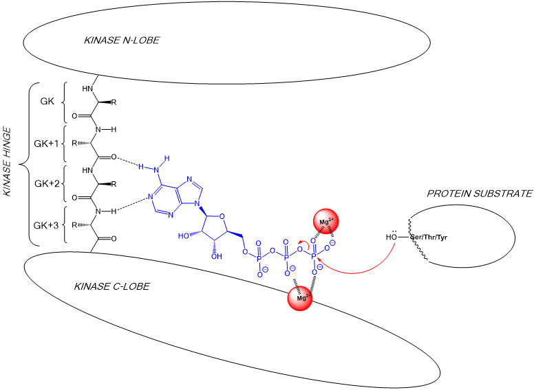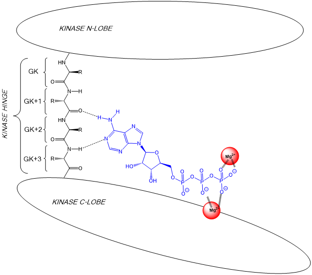 The ATP adenosine head is bound to AAs by specific H bonds with the backbone of the GK+1 and GK+3 amino acids of the hinge region.