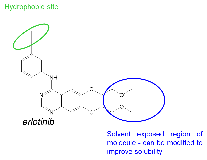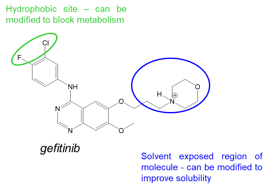 37: Gefitinib is a kinase inhibitor which targets EGFR. It competes with ATP by forming competitive interactions - hydrogen bonds to GK+3 (met 793) and targets the region behind the GK side chain (N lobe), Thr 790. It is a potent inhibitor with poor solubility and low bioavailability and is rapidly metabolised.