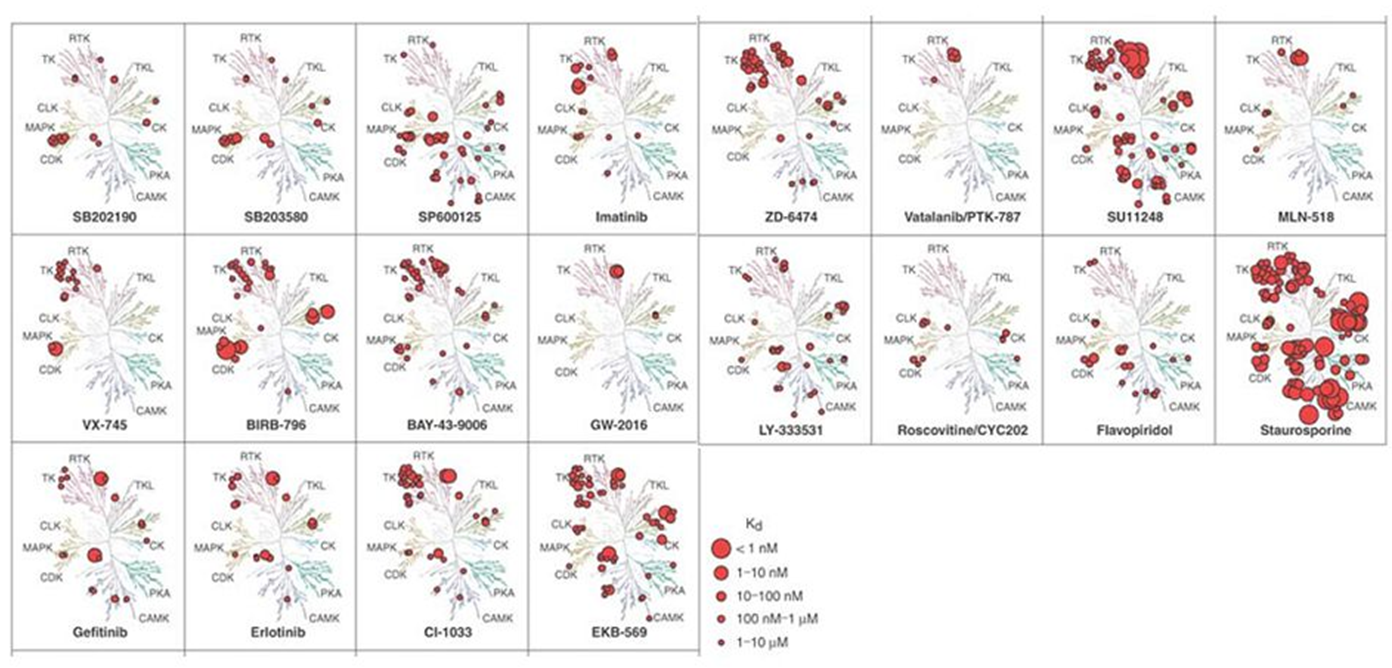 Below is way of representing kinase tree that shows how different inhibitors affect them Some eg staurosporine inhibit many kinases - used as positive control in kinase assays
