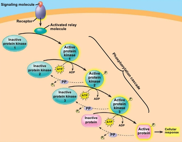 13: Another consequence of kinase action is protein movement. Phosphate attachment can cause a protein to be attracted to other proteins which have positively charged motifs. They can be recruited to the membrane or nucleus to transport the signal around the cell.