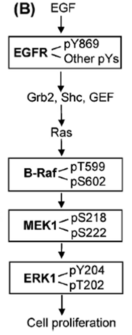 They (kinases?) can activate themselves, typically after dimerisation when ligand bound eg EGF binding EGFR → dimerisation and autophosphorylation, converting EGFR into an active conformation. Activated EGFR can attract proteins to it via the phosphate group and phosphorylate other substrates to initiate signalling