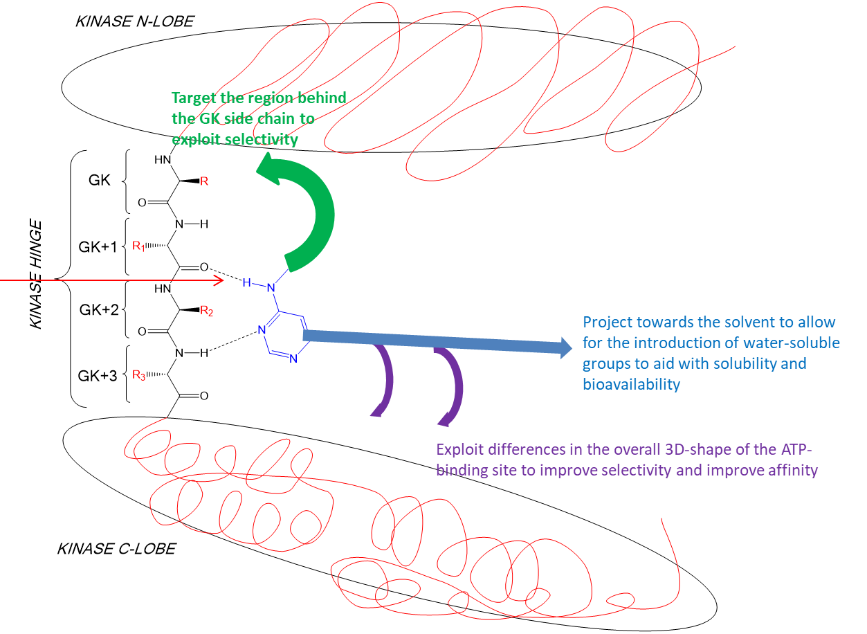 35: Kinase inhibitors usually begin as a heterocycle which targets the hydrogen bonding groups of the hinge region (shown in blue)