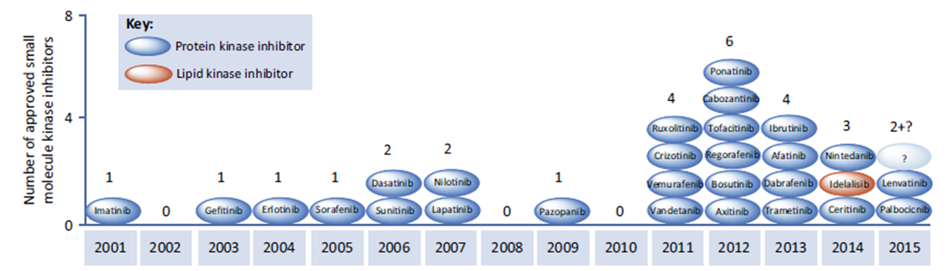 9: Kinase inhibitors currently in clinical use. bcr-abl = fusion protein targeted by imatinib (development started in early 90s, came into market in 2001)