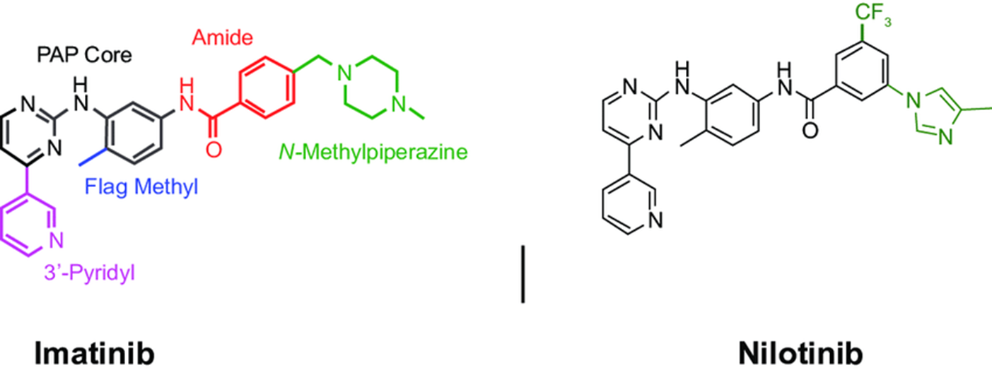 one of big challenges with cancer is resistance developing to treatment due to change in protein structure over time (change in chemical space). This is one of reasons why nilotinib was developed as a later generation of imatinib. Many of inhibitors shown are 3rd or even 4th generation kinase inhibitors