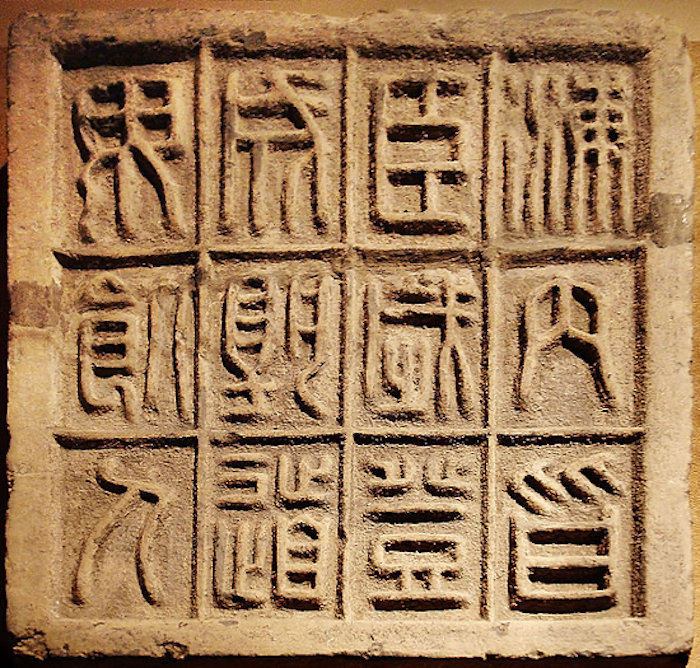 Stone slab with twelve Qin seal characters. By Editor at Large, CC BY-SA 2.5.