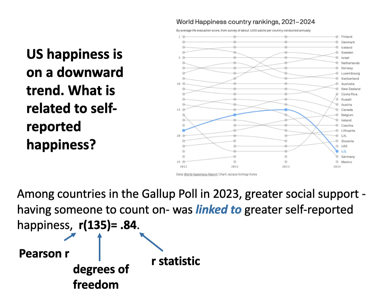 correlation statistic: the strength and direction of the relationship between two quantitative variables
