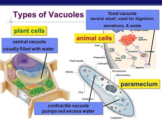 Vacuoles: membrane- bound sacs. Found in both animal cells and plants cells but more in plant cells. Smaller in animal cells and Larger in plant cells.