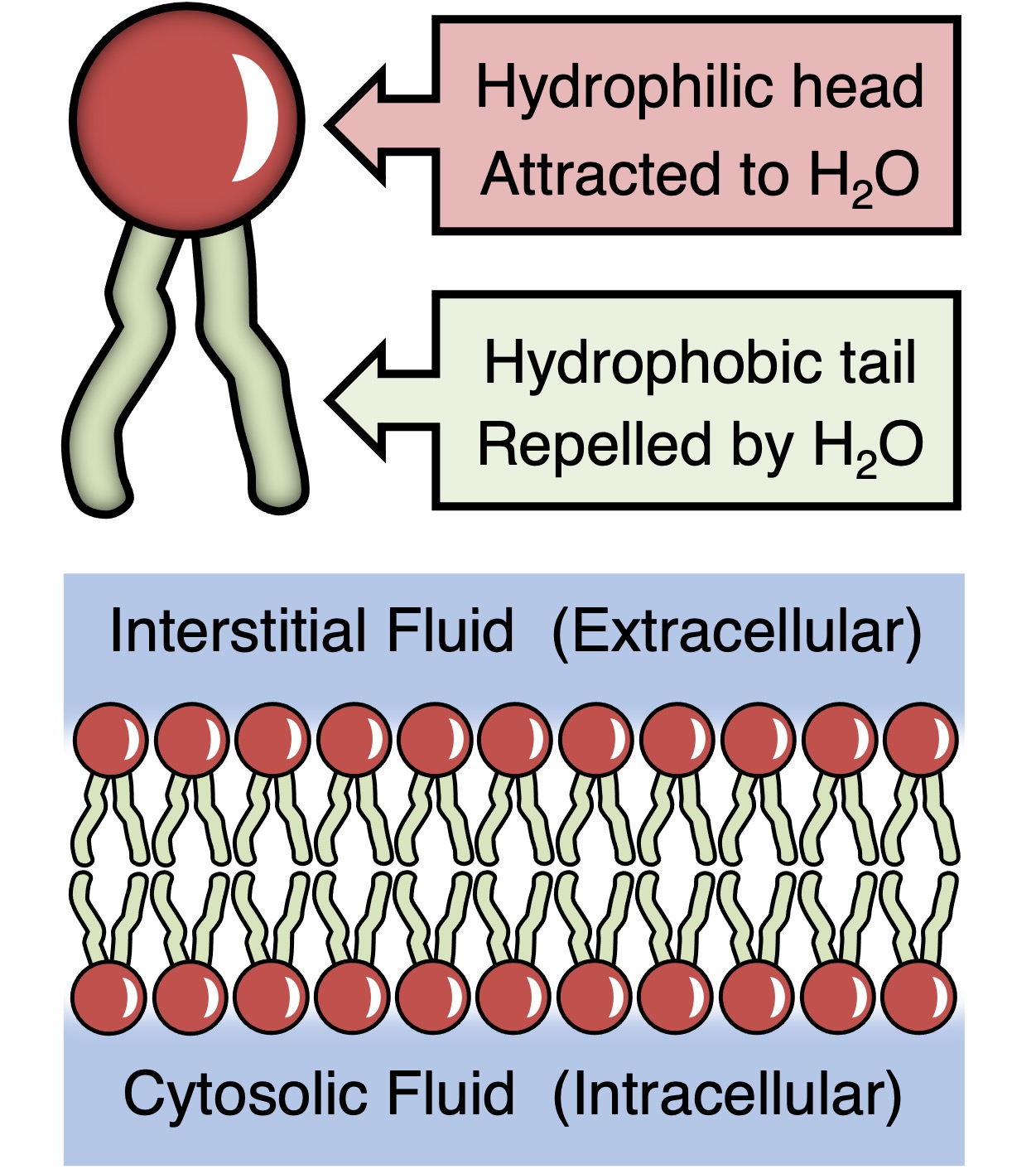 Phospholipids have a phosphate, glycerol and 2 fatty acids. Hydrophilic head and hydrophobic tail. Amphipathic is a word thats used to describe it. Because it has two different regions. One loves water and the other hates it.