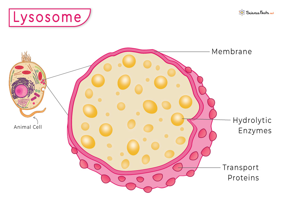 Lysosomes: membrane- bound organelle, has hydrolytic enzymes inside that break down things and has transport proteins, made from Golgi complex