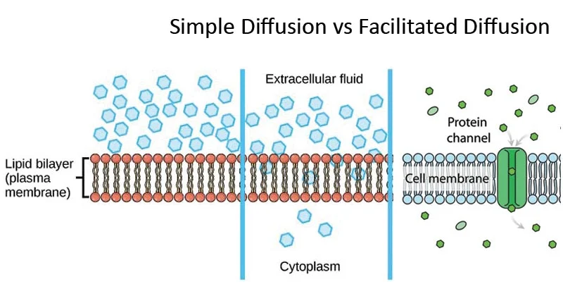 Simple diffusion: no energy required, its passive transport. When water passes through the membrane in tiny amounts or gases. Small or non polar substances, also steroids and hormones.