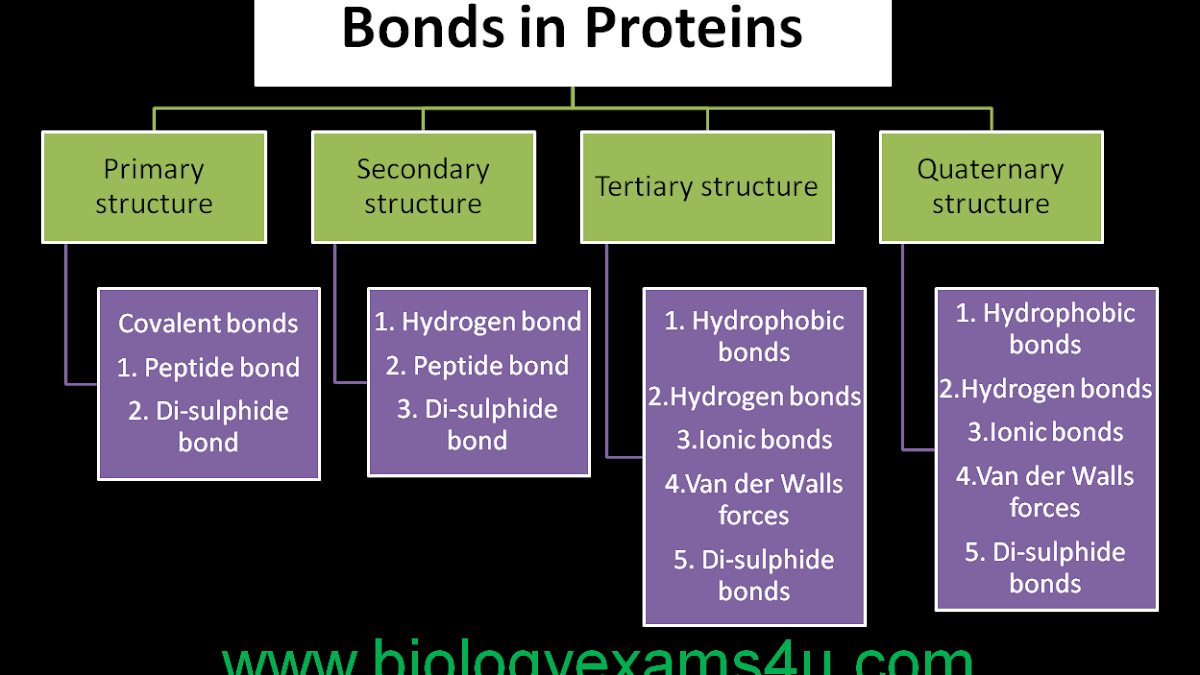 Tertiary: Bonded by hydrogen bonds, hydrophobic interaction, ionic interaction or disulfide bridges between R groups. 3D shape starts to form. Hydrophobic ions come together and move away from water.