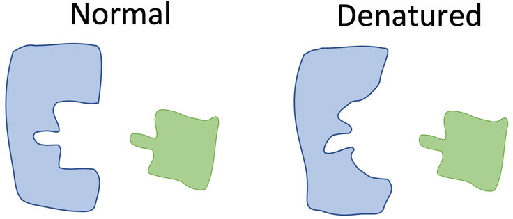 Denaturation: Change in structure of the protein. This happens when the enzyme is exposed to a temp that isn’t the optimal for its activity, resulting in a loss of its functional shape and ultimately preventing it from catalyzing reactions effectively. Different pH and temp messes with H+ ions and this alters the hydrogen bonds that make up the enzyme.