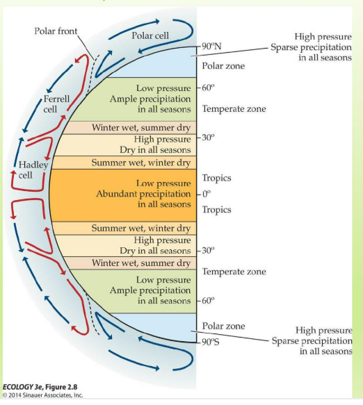 2. How does the global distribution of insolation affect temperature? Air circulation and upwellings? Rainfall? Be able to explain the processes. Likely that a number of questions will come from these topics.