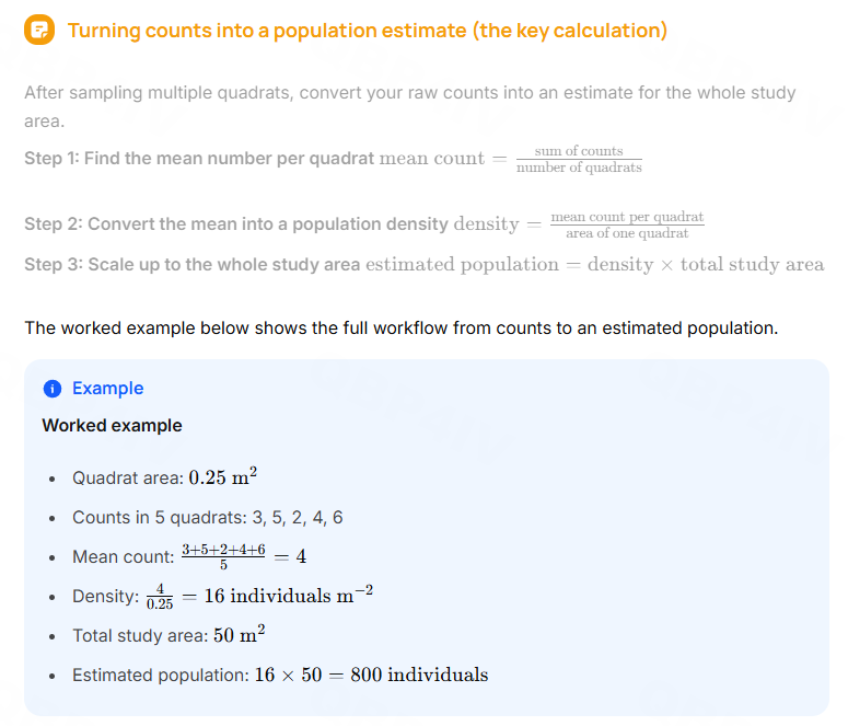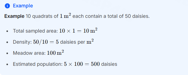 Population density = total indivual counted in all quadrats/ total area sampled (sum of quadrat areas)