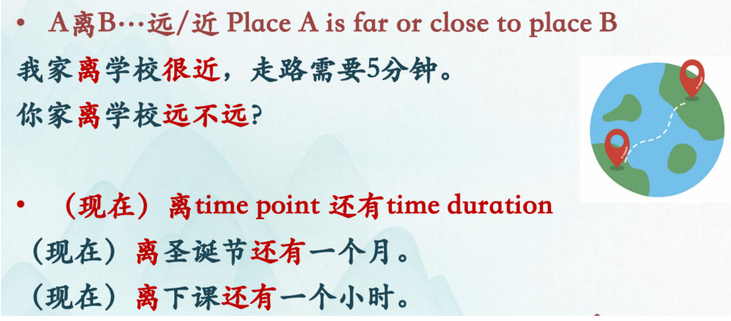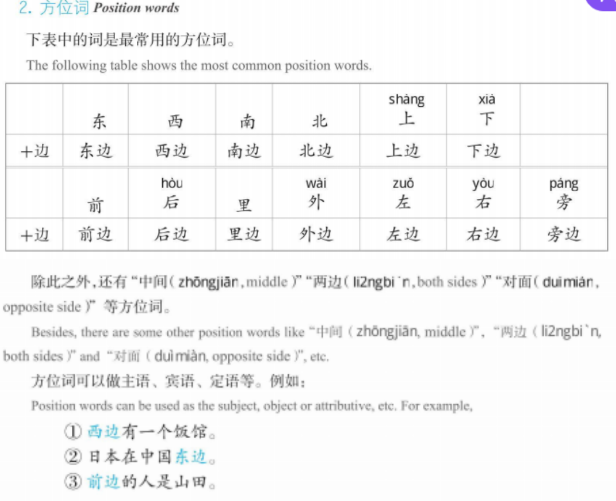 B 在 A 的 + location/position (somewhere是什么地方?): 教学楼东边是运动场。 or A(的)+location 是B (......在哪儿?): 运动场在教学楼东边。(A->B)