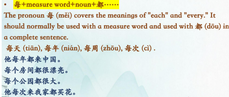 每measure word +noun都......: 我们班每个人都会说汉语。