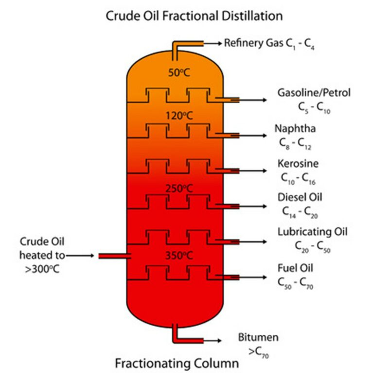 A furnace heats the crude oil to 400oC. The column is hotter at the bottom and cooler at the top. Rising vapour condenses when it reaches the tray with liquid at a temperature just below its boiling temperature. This releases energy which heats the liquid on the tray and evaporates the more volatile compounds.