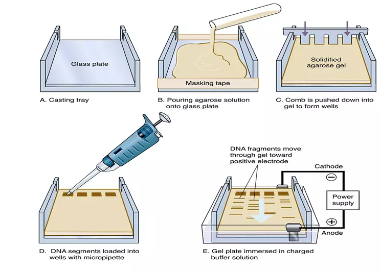 - To set up an electrophoresis chamber, the gel is placed in a casting tray with a comb at one end. The casting tray is then placed in the electrophoresis chamber with buffer solution added to cover the gel. The samples are loaded into wells at the opposite end of the gel from the comb.