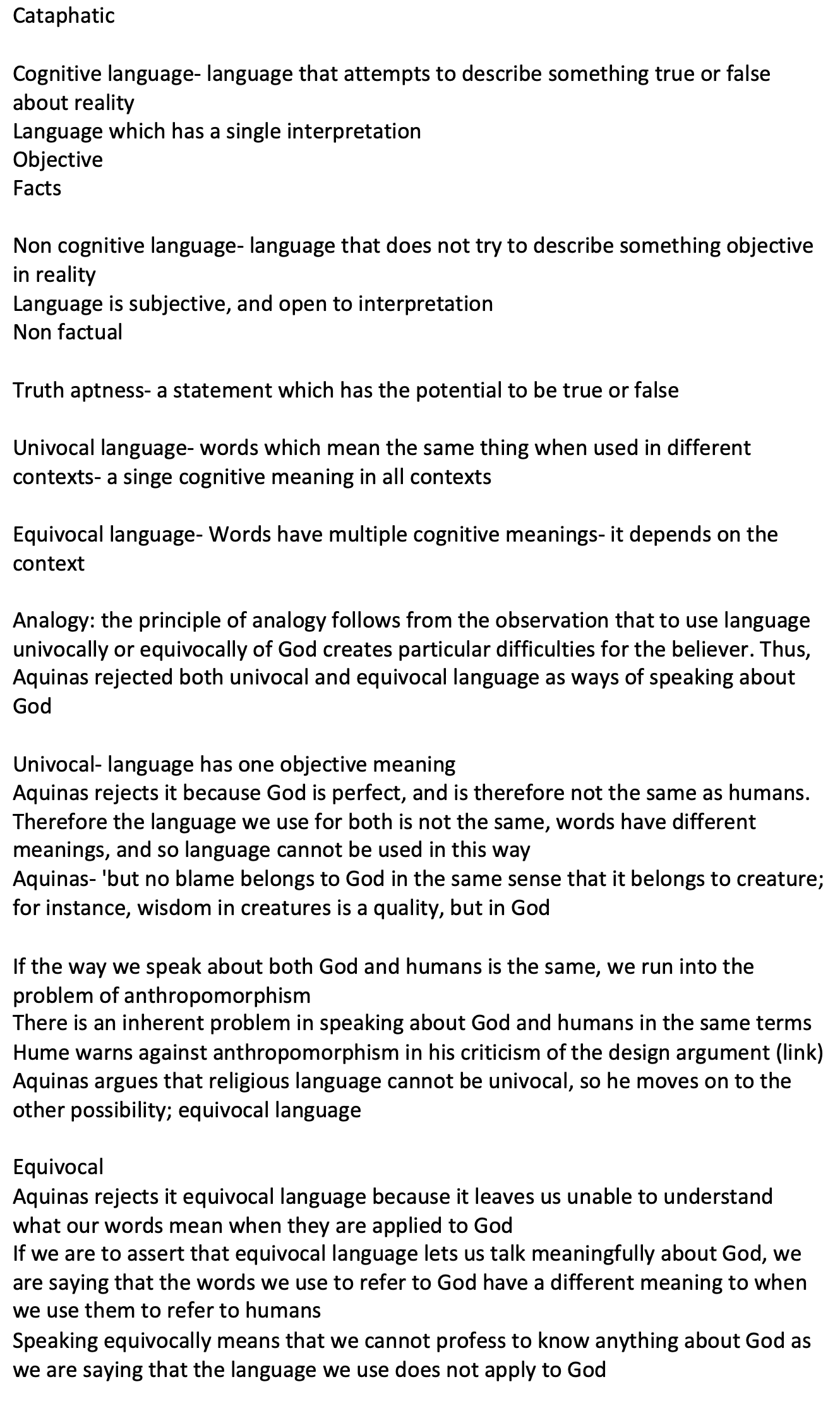 .The Bible speaks of God in a cataphatic way- 1 John 4.16- 'God is love'. .Some things do not need to be known to us- the Bible provides us with all the knowledge we need . The process of negation is too long to be of any use. - Maimonide's analogy of the ship- the 10th person thinks about whether the ship is solid. Yes it is solid, but it doesn’t provide a sufficient definition of a ship. . The process of negation leaves gaps which need to be filled by the imagination- e.g. fence analogy- you have to imagine what is on the other side of the fence . Ultimately, arguing what God is not gets us no closer to true knowledge of what God is . Revealed theology- Christians believe that God chooses to reveal His nature to humans, and in doing so giving us positive knowledge of God. This suggests that through revelation, we can know about God in positive terms . Christians believe that God wants humans to come to know Him so that He can have a relationship with us. That is, after all, the purpose of the incarnation. . Natural theology: believes that we can draw positive conclusions about God's nature by combining observation of the world with our reason .Which ever side of the debate between natural and revealed theology you fall upon, both claim knowledge of God is formed in a positive way . Christians believe that we can know God. Knowledge of His nature is a basis for faith i.e. He is worthy of our worship because He is omnipotent and benevolent .Arguing that we can speak more accurately about God in negative terms is problematic for Christians, as the phrase 'God does not exist' is more accurate than 'God exists' . Anthony Flew argued that if we try to explain God as invisible, soundless, incorporeal and so on, there's little difference between our definition of God and our definition of nothingness |