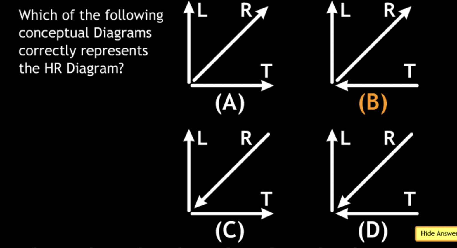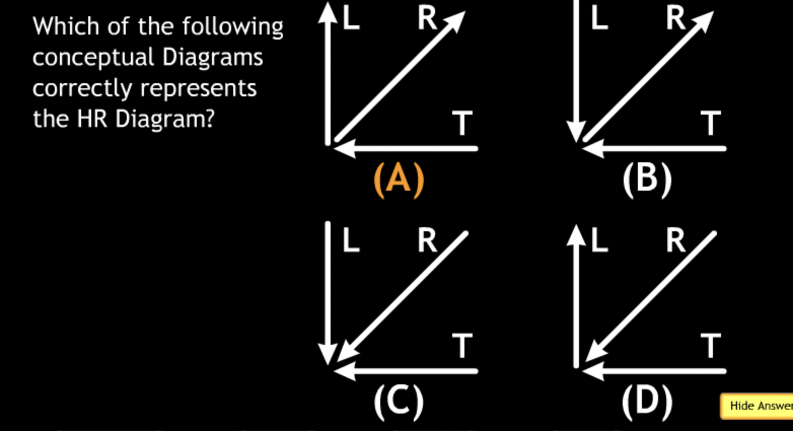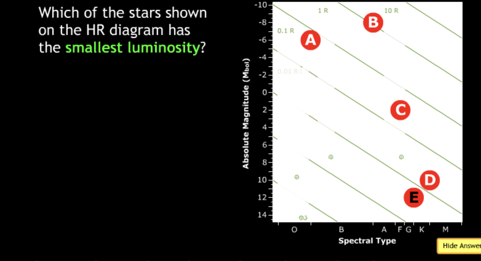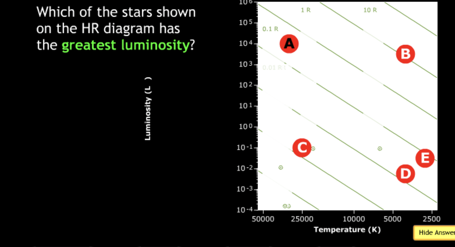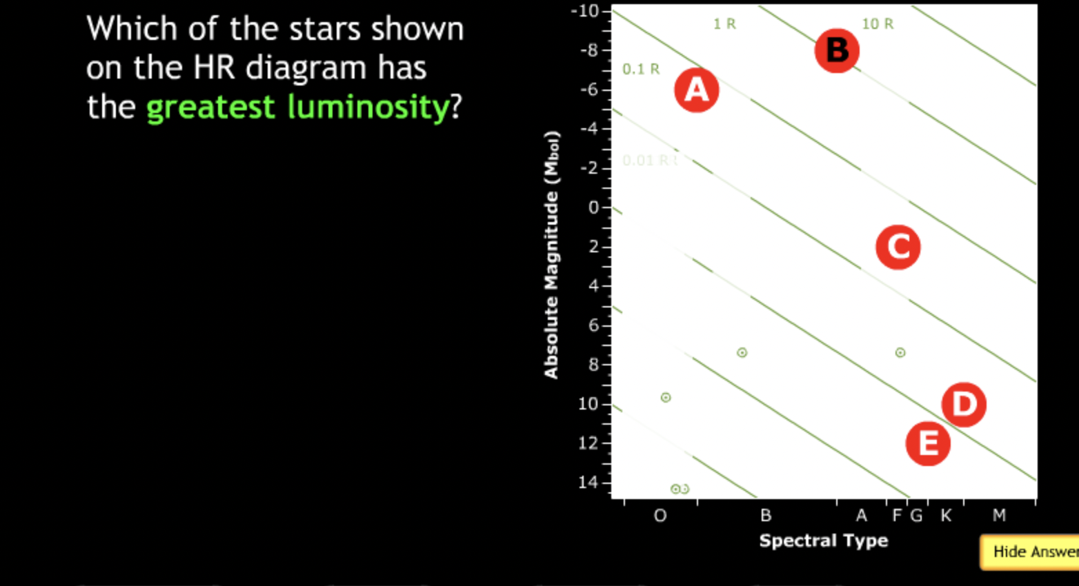 The brightest stars we see with our eyes are best described on the HR Diagram as… high luminosity stars.