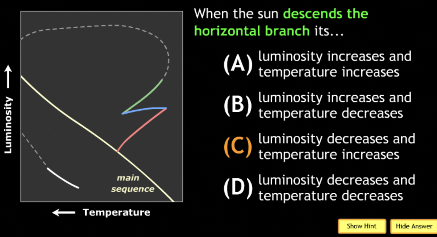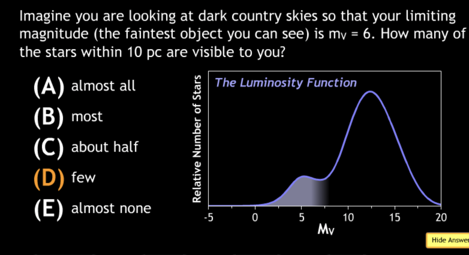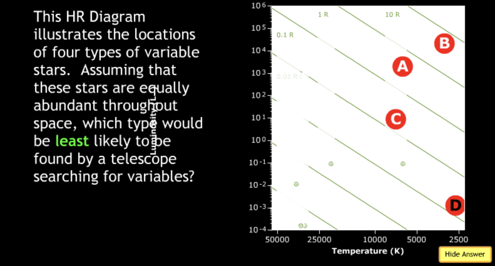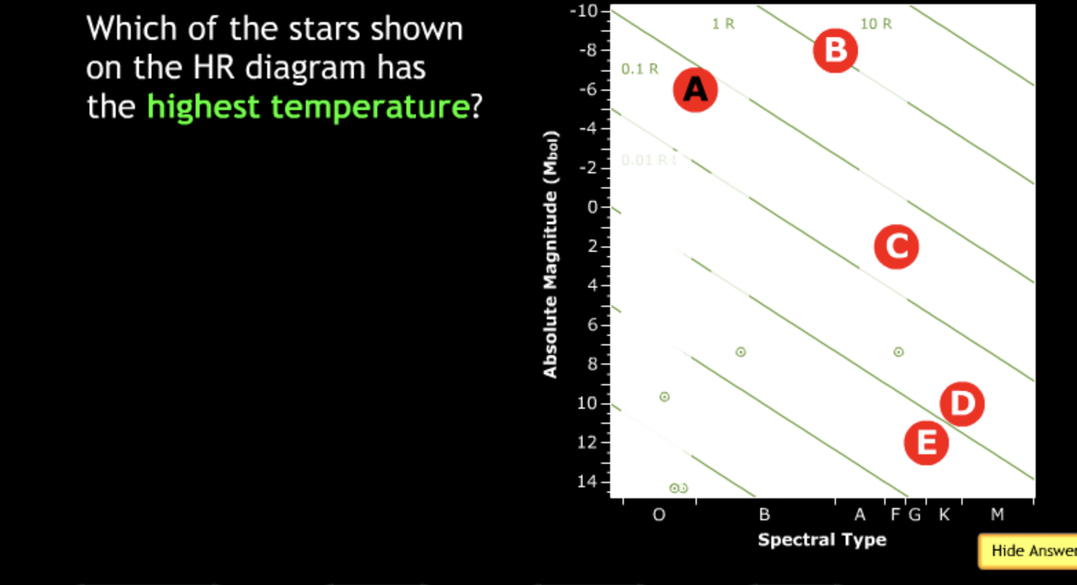 The brightest stars we see with our eyes are best described on the HR Diagram as… high luminosity stars.