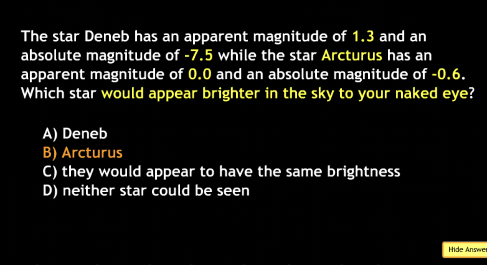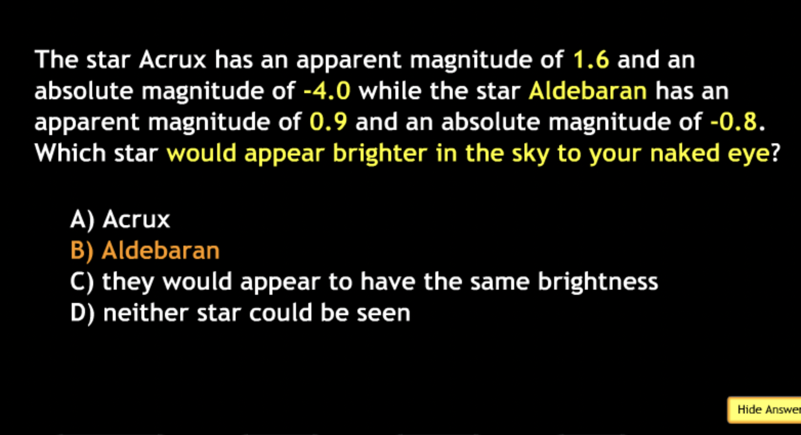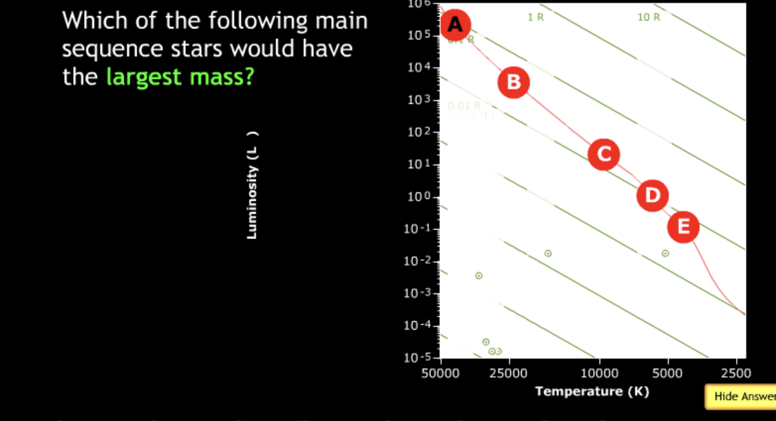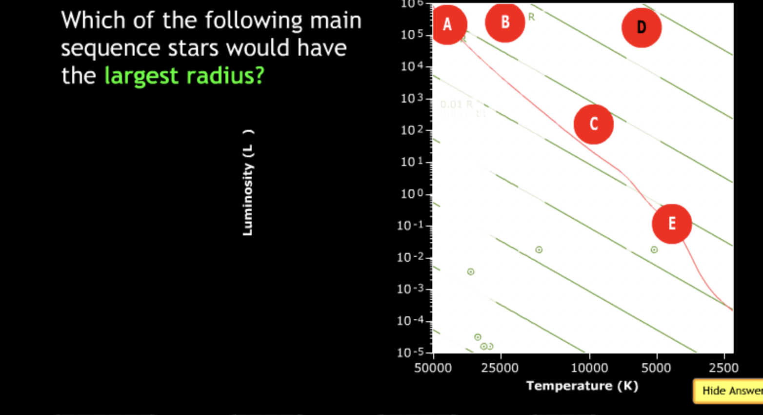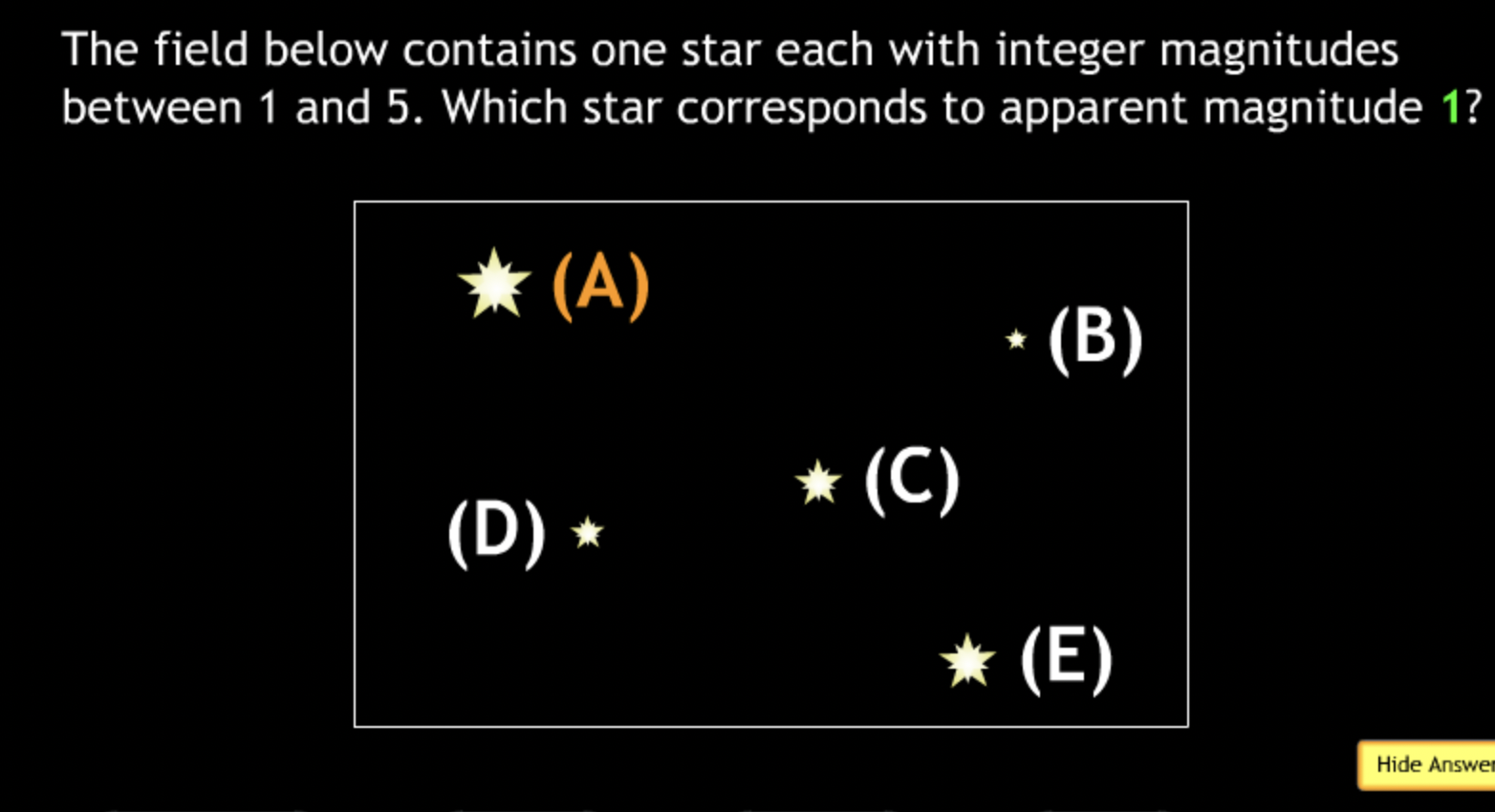 The brightest stars we see with our eyes are best described on the HR Diagram as… high luminosity stars.