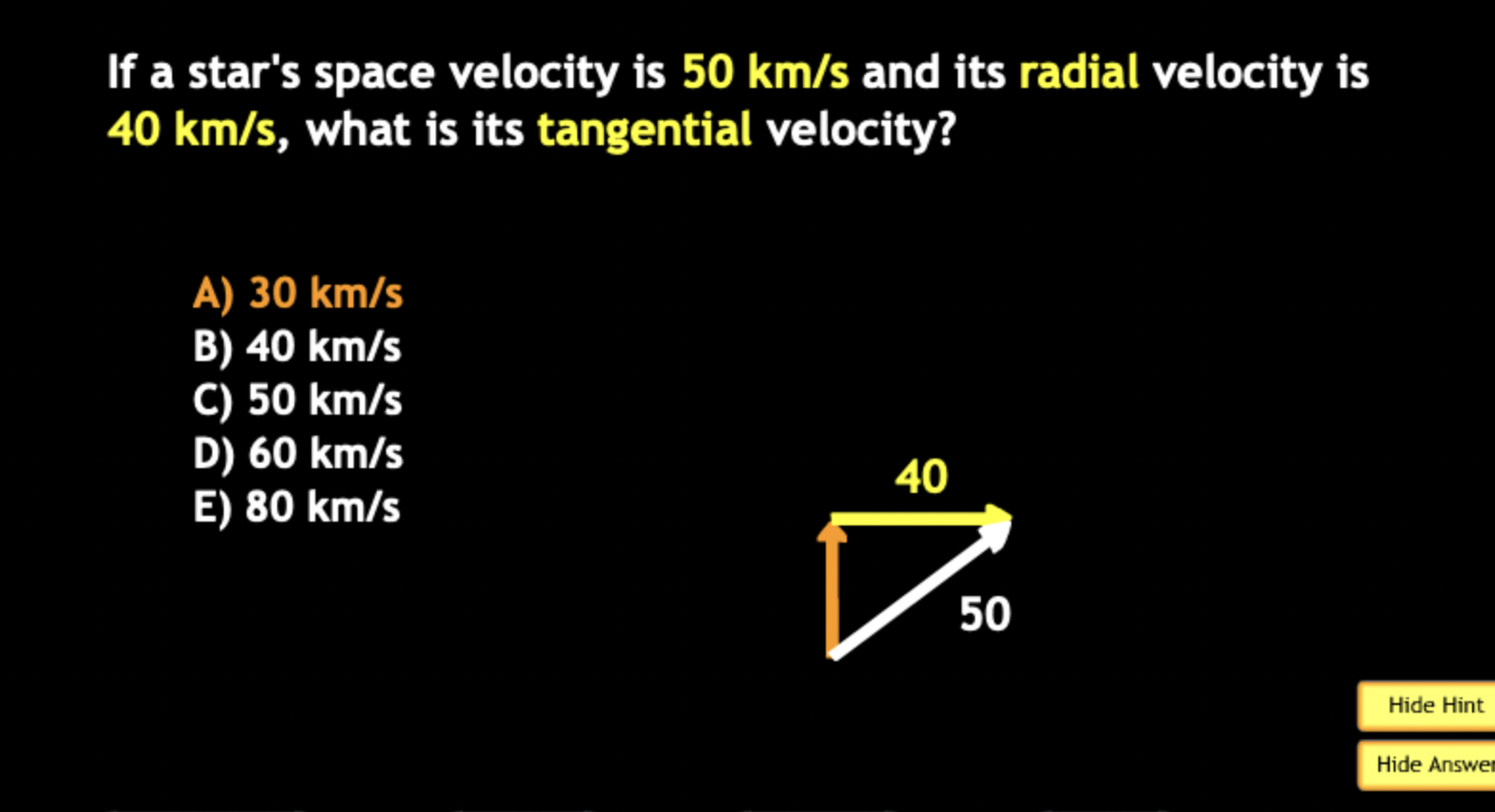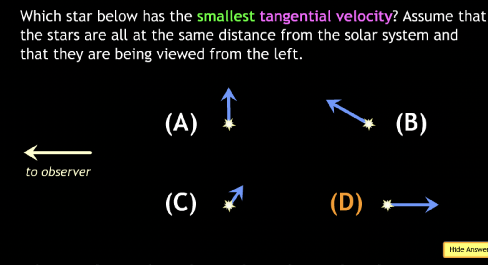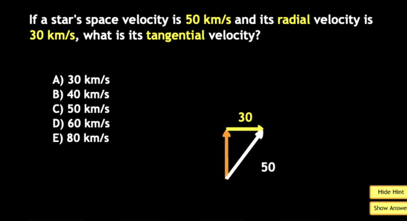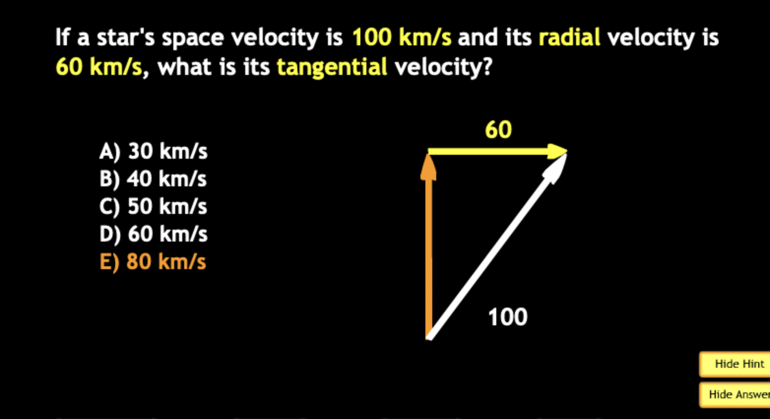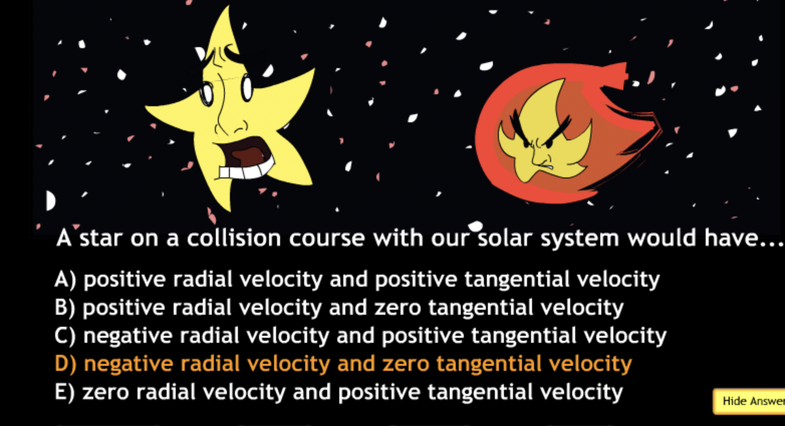 A star’s motion is given as 35km/s. This could be referring to the star’s… radial or tangential velocities.