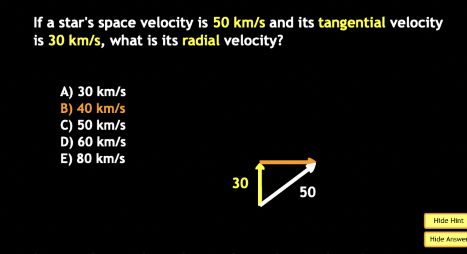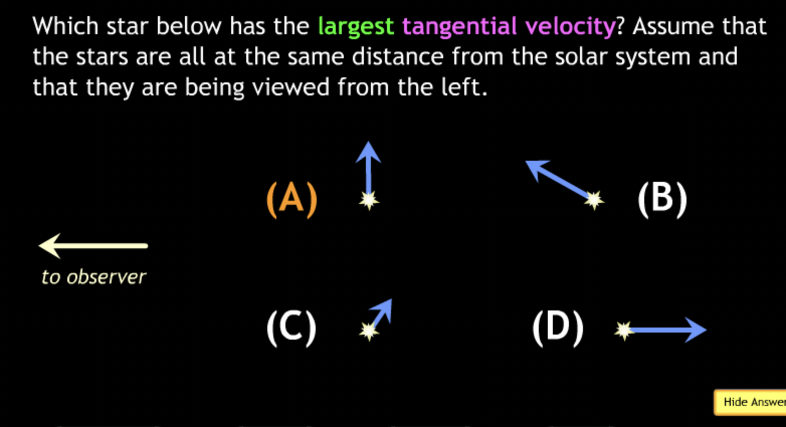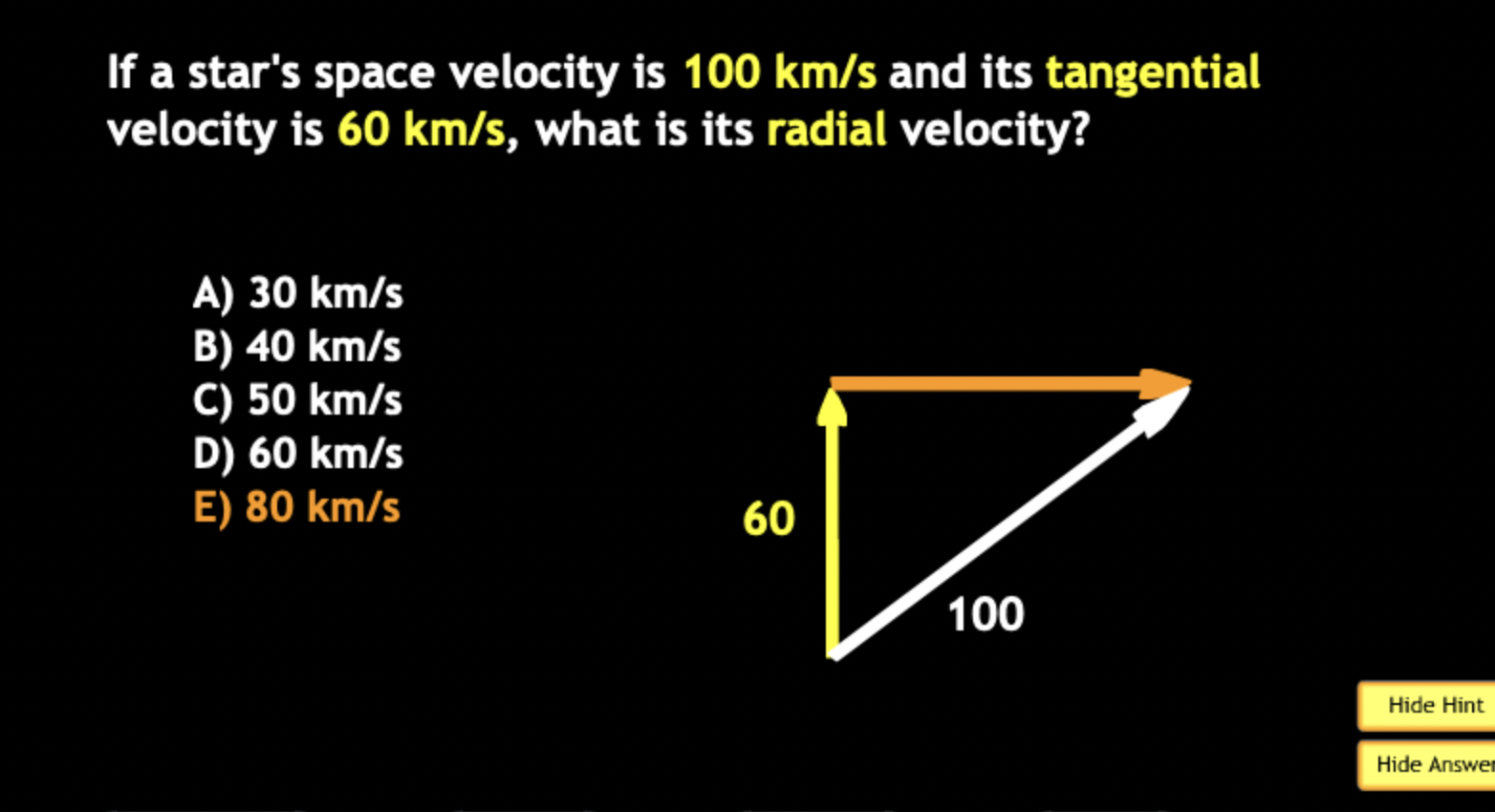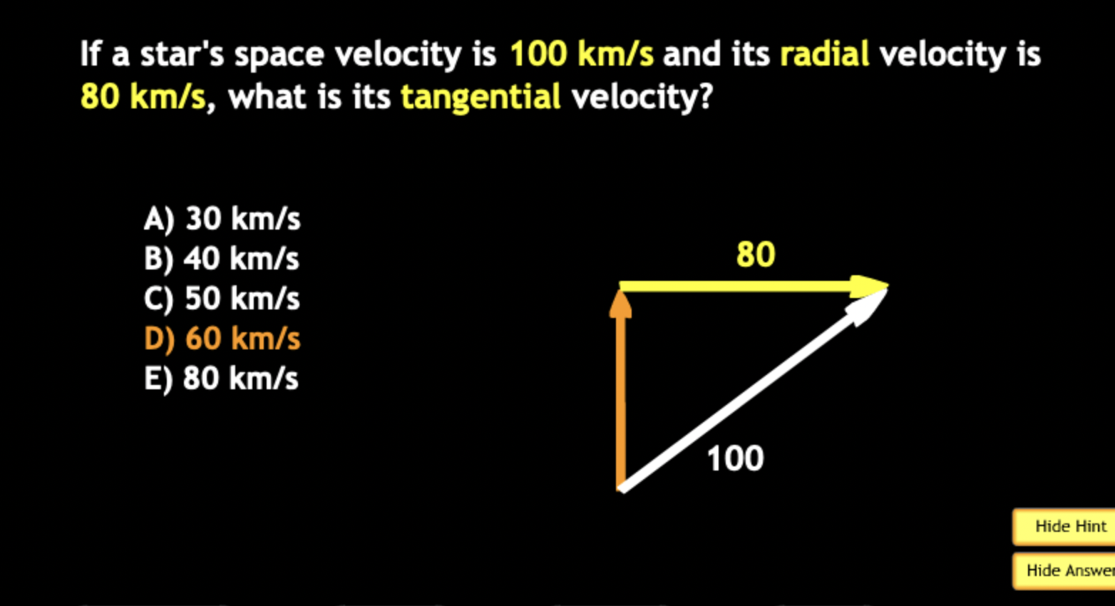 A star’s motion is given as 35km/s. This could be referring to the star’s… radial or tangential velocities.