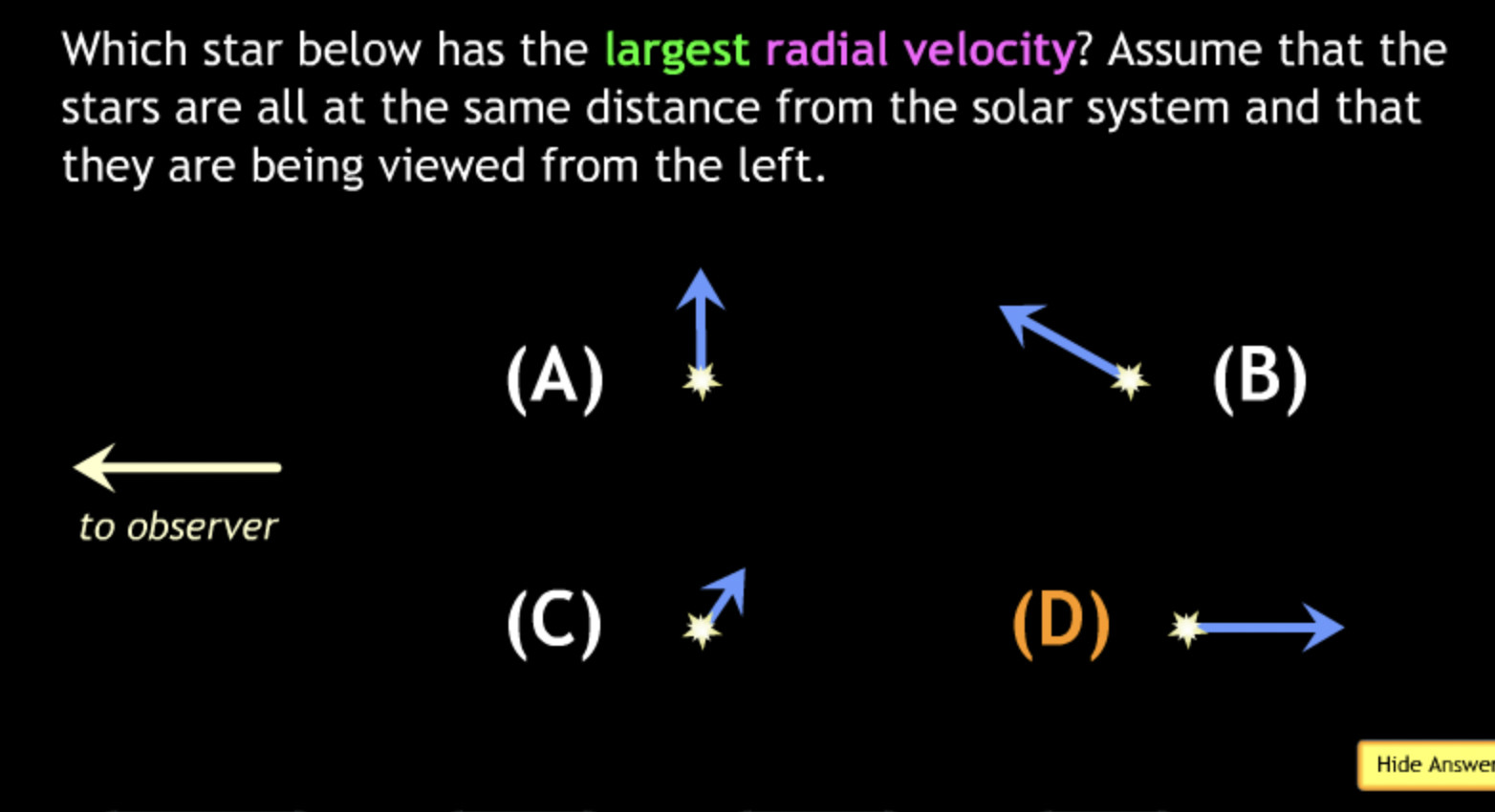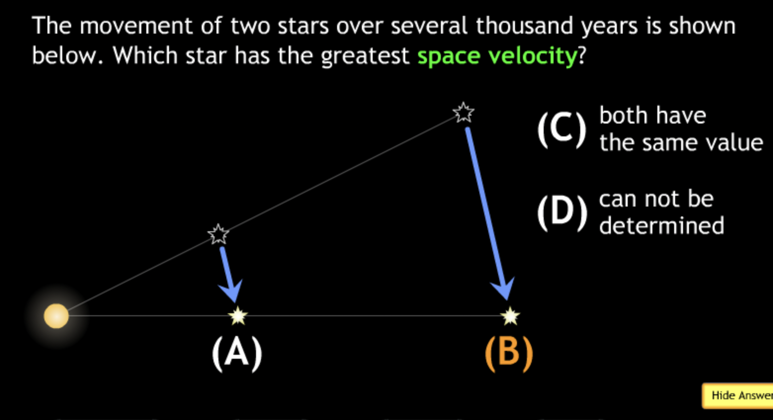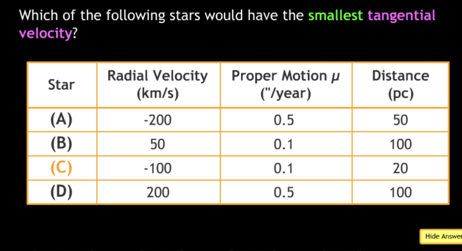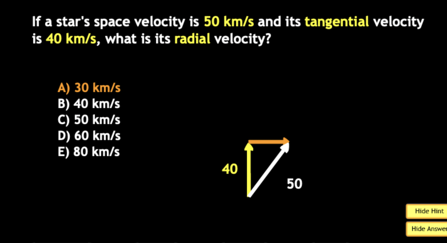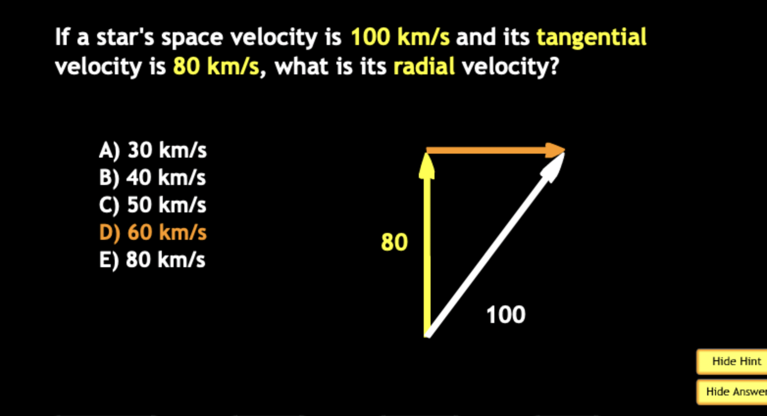 A star’s motion is given as 35km/s. This could be referring to the star’s… radial or tangential velocities.