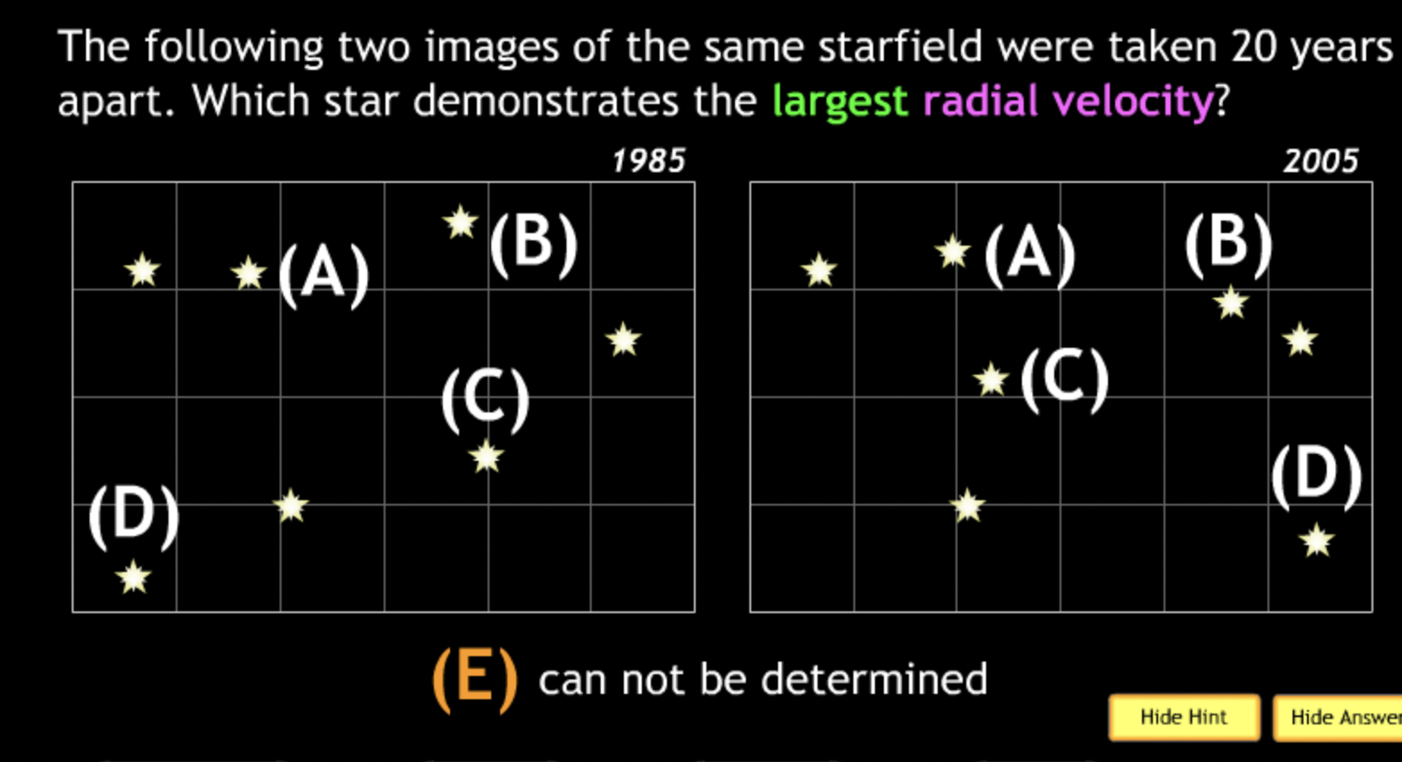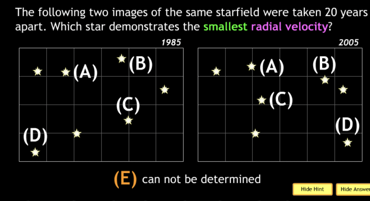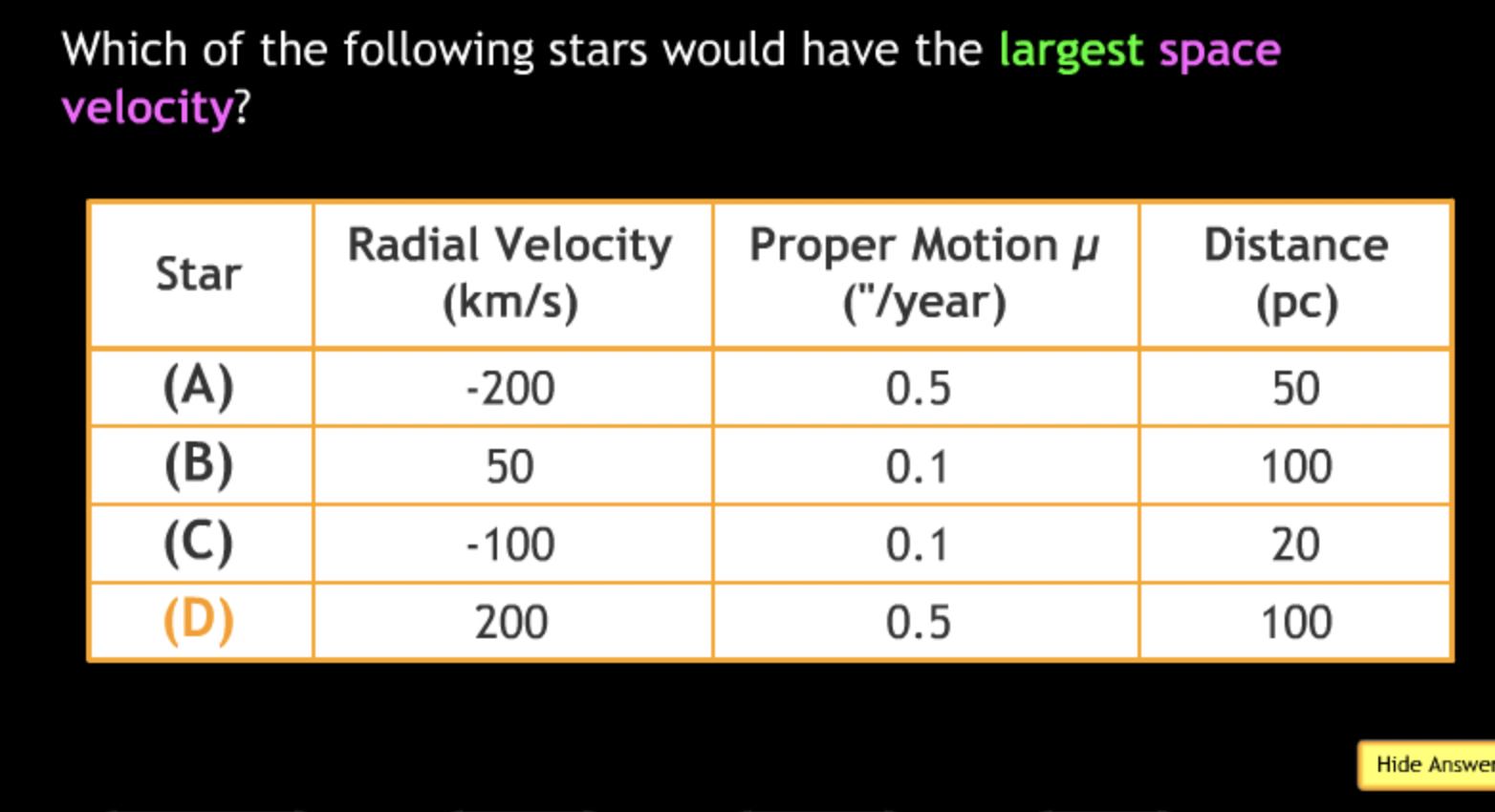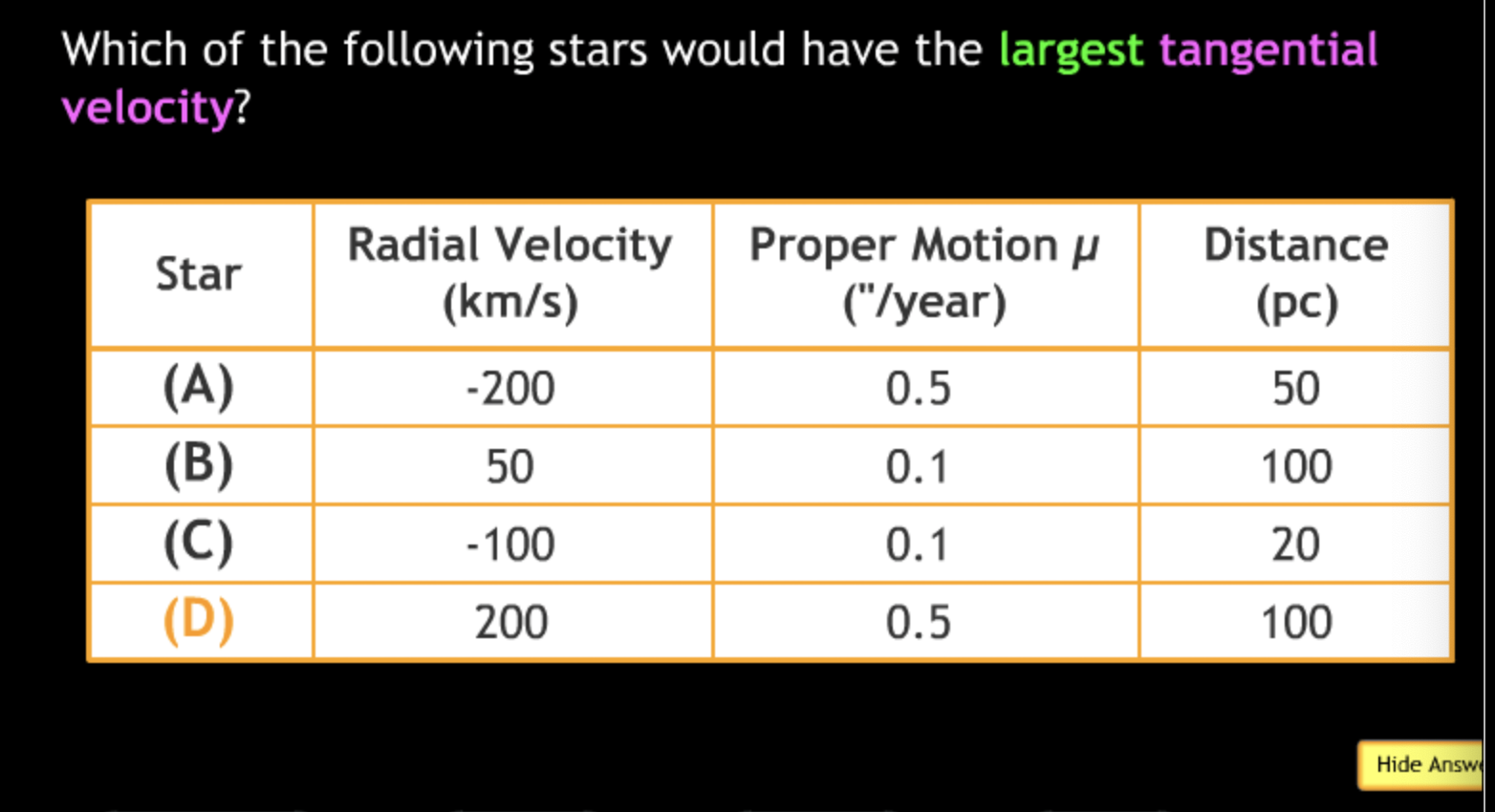 A star’s motion is given as 35km/s. This could be referring to the star’s… radial or tangential velocities.