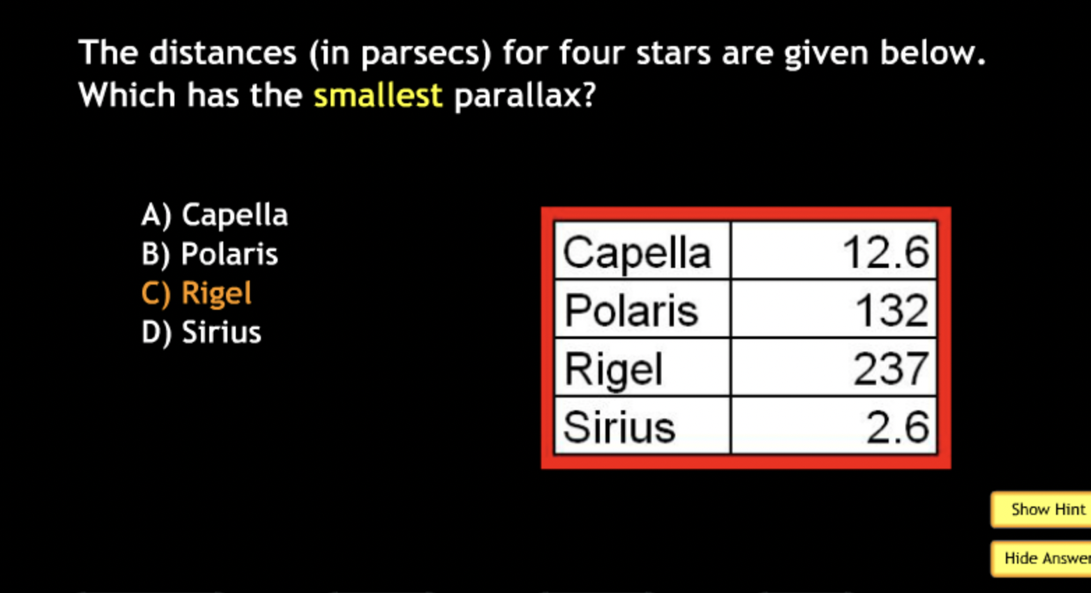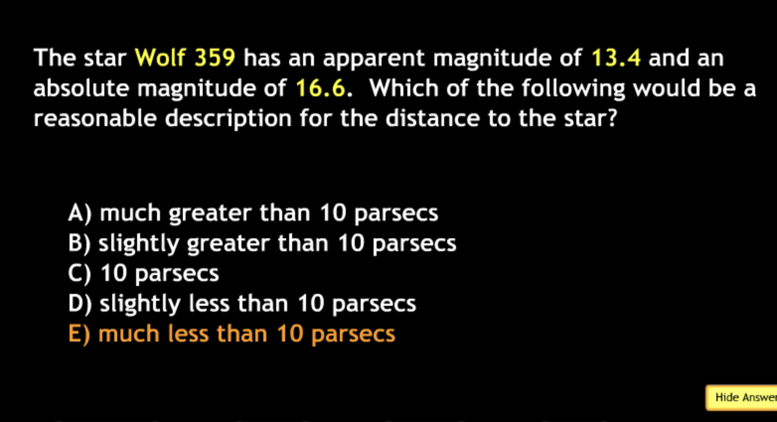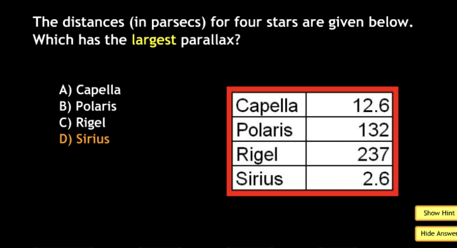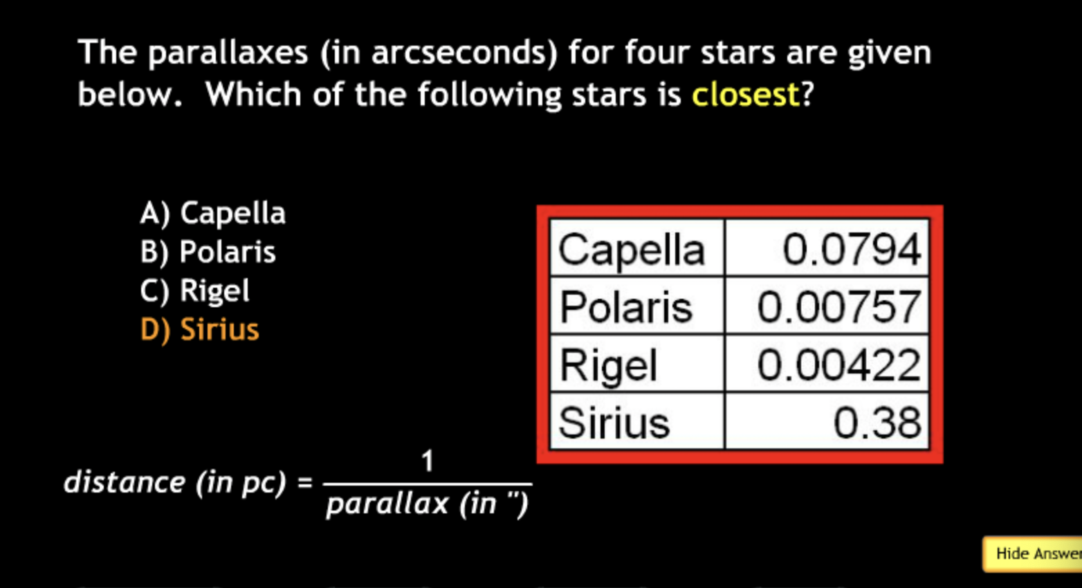 If a star has a parallax of 0.1 arcsecods, it must be at a distance of… 10 parsecs.