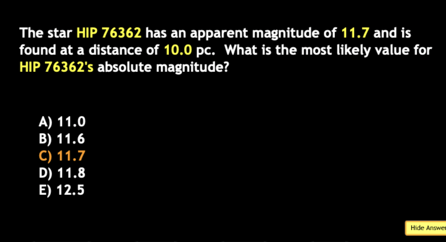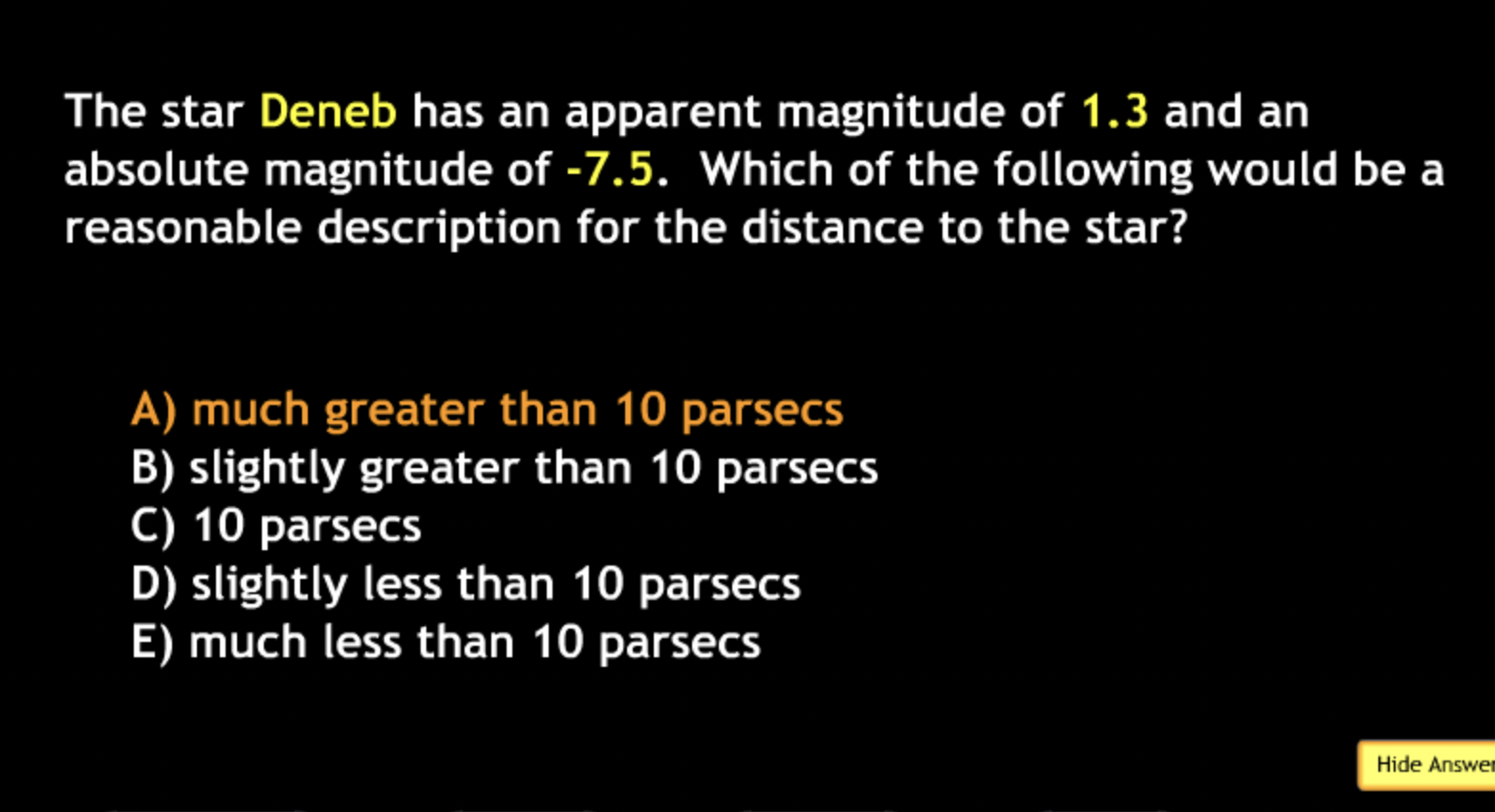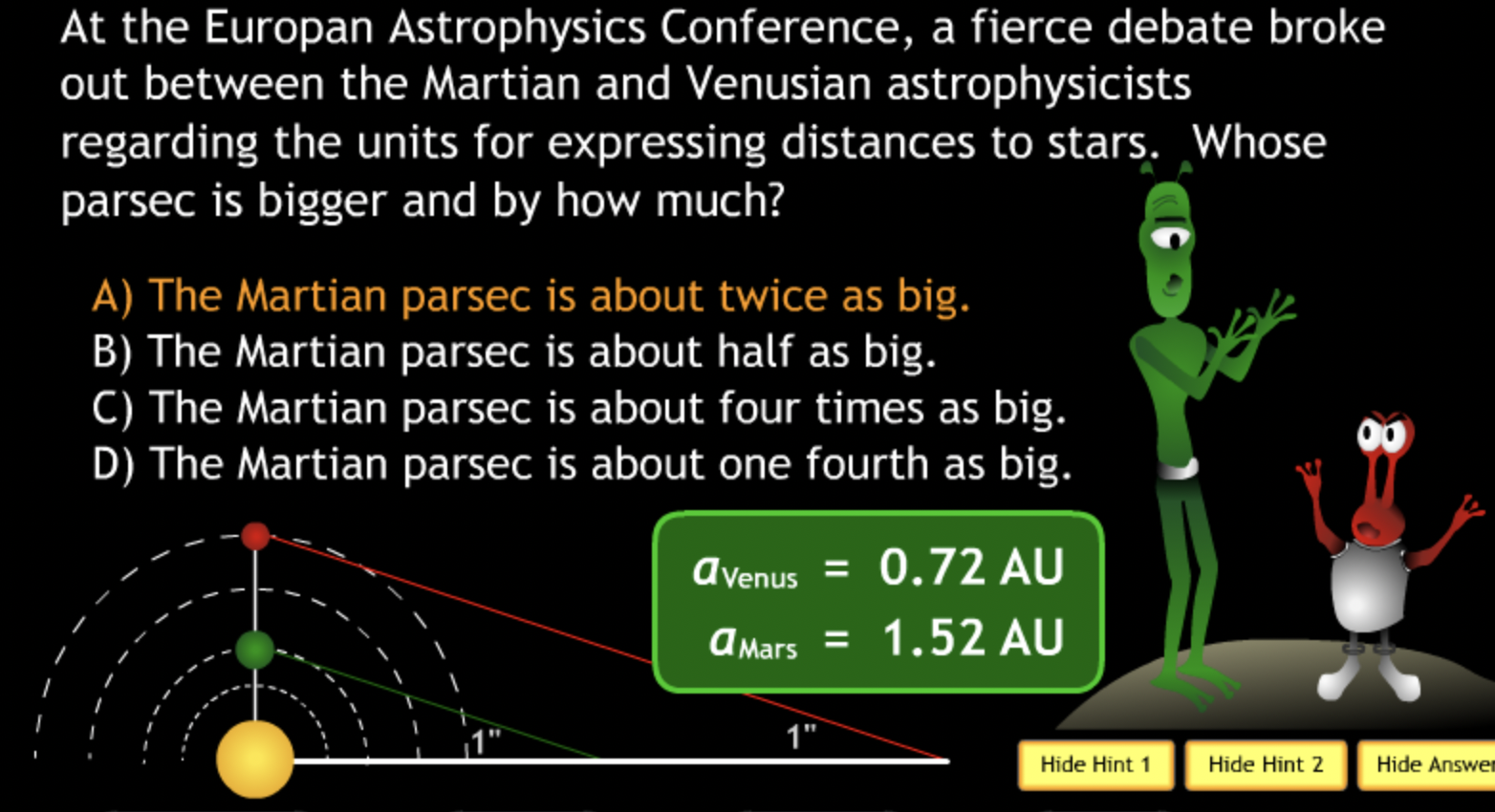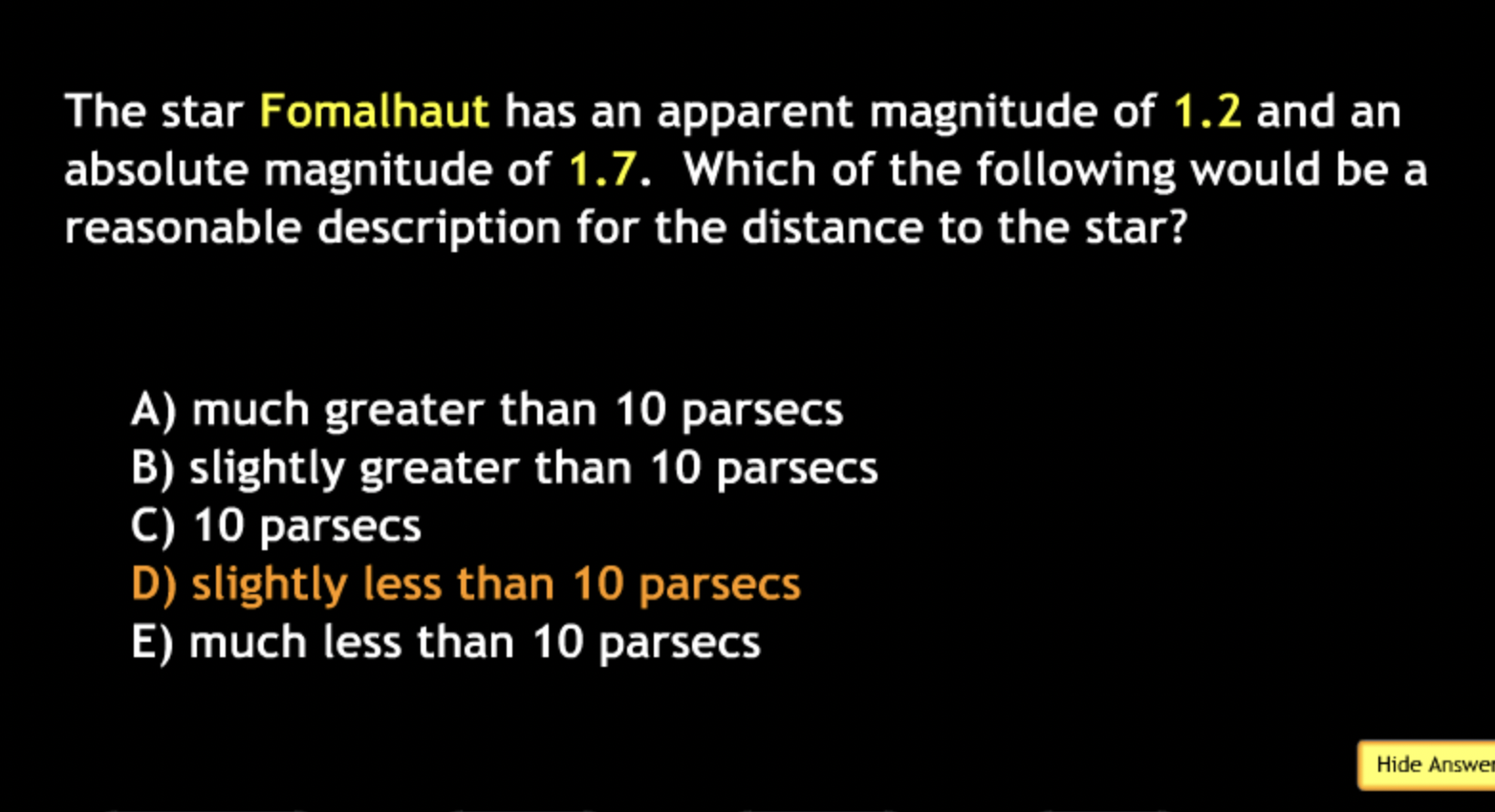 If a star has a parallax of 0.1 arcsecods, it must be at a distance of… 10 parsecs.