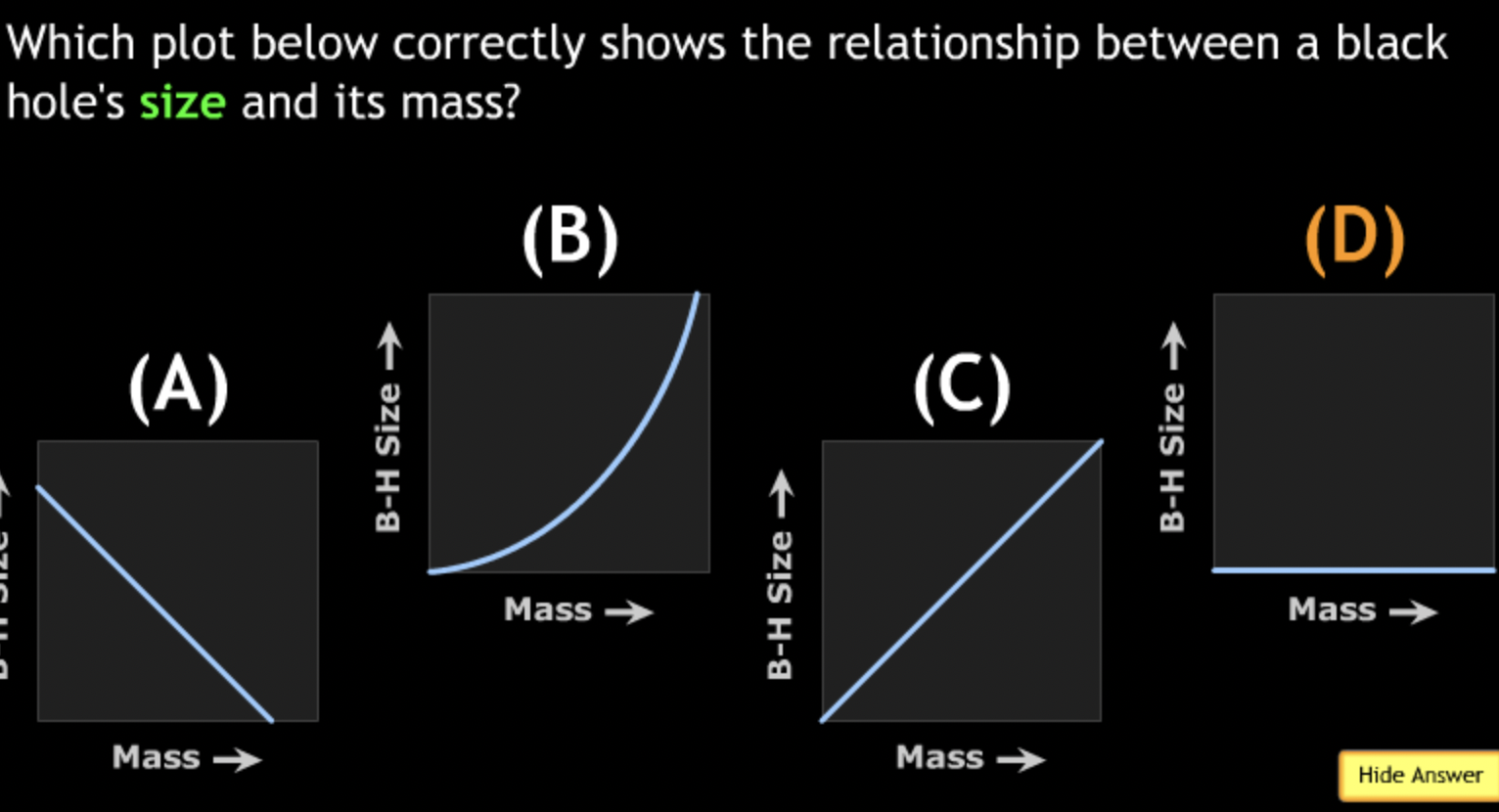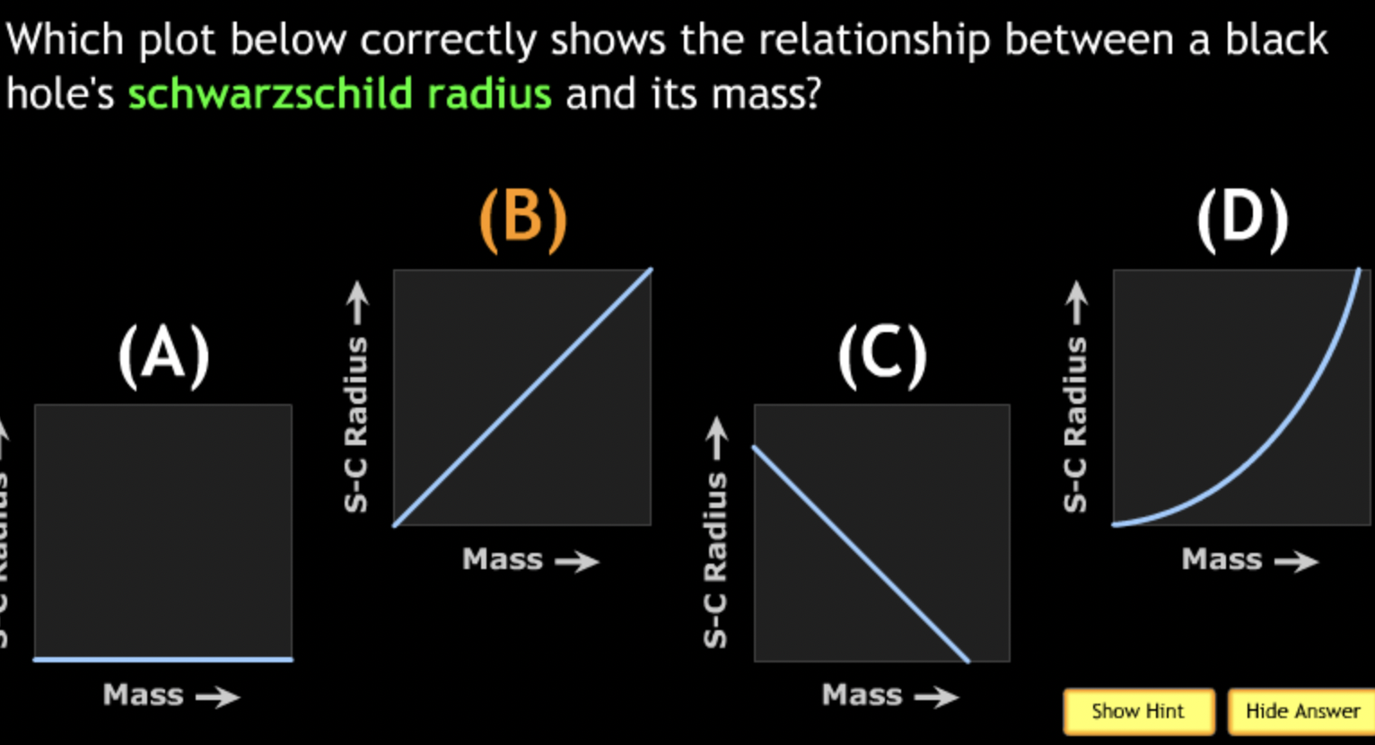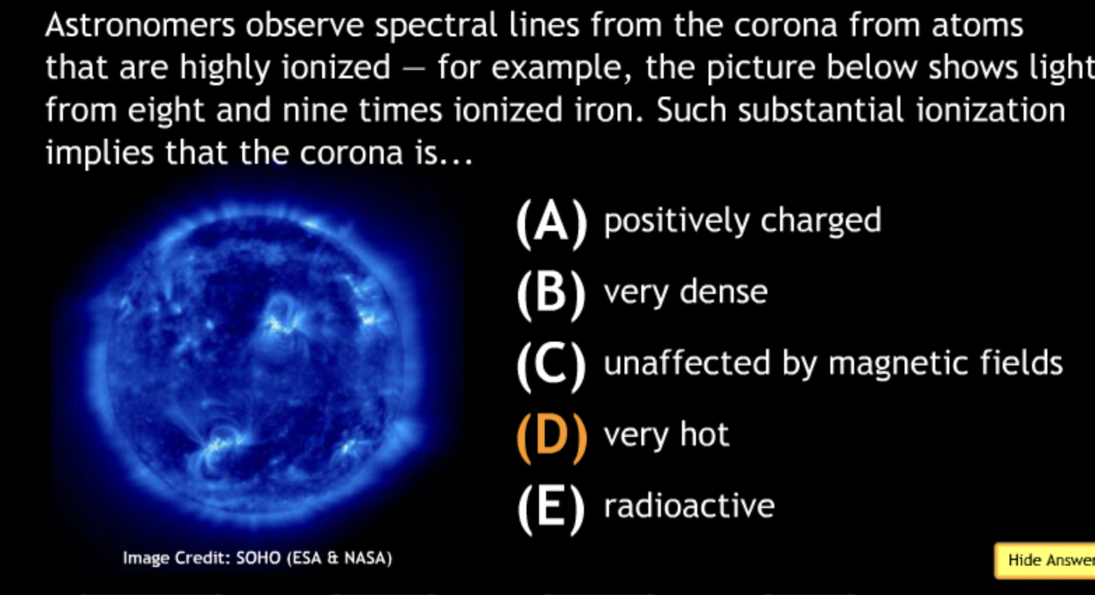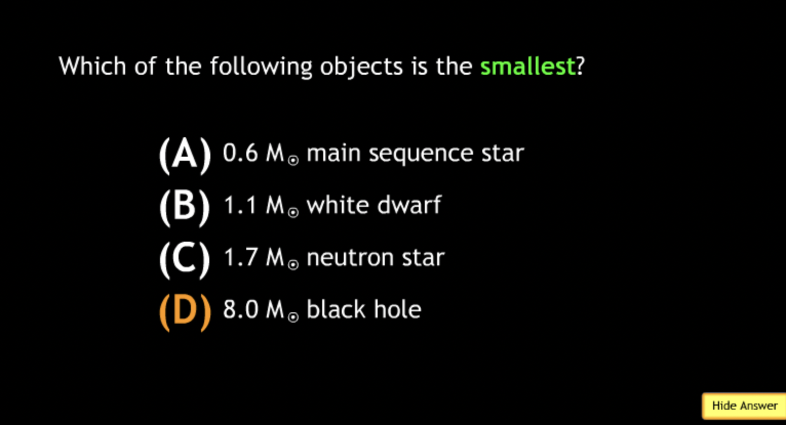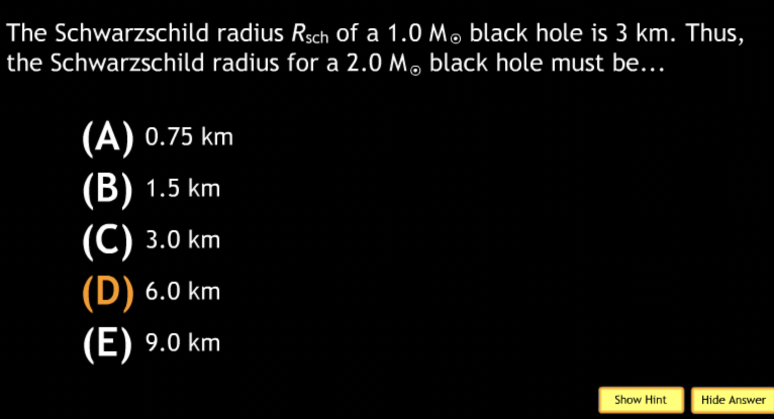 Emissions from the x-ray source Cygnus X-1 vary over timescales as small as 0.01 seconds. This implies that the size of the x-ray producing region must be…. smaller than 3000 km