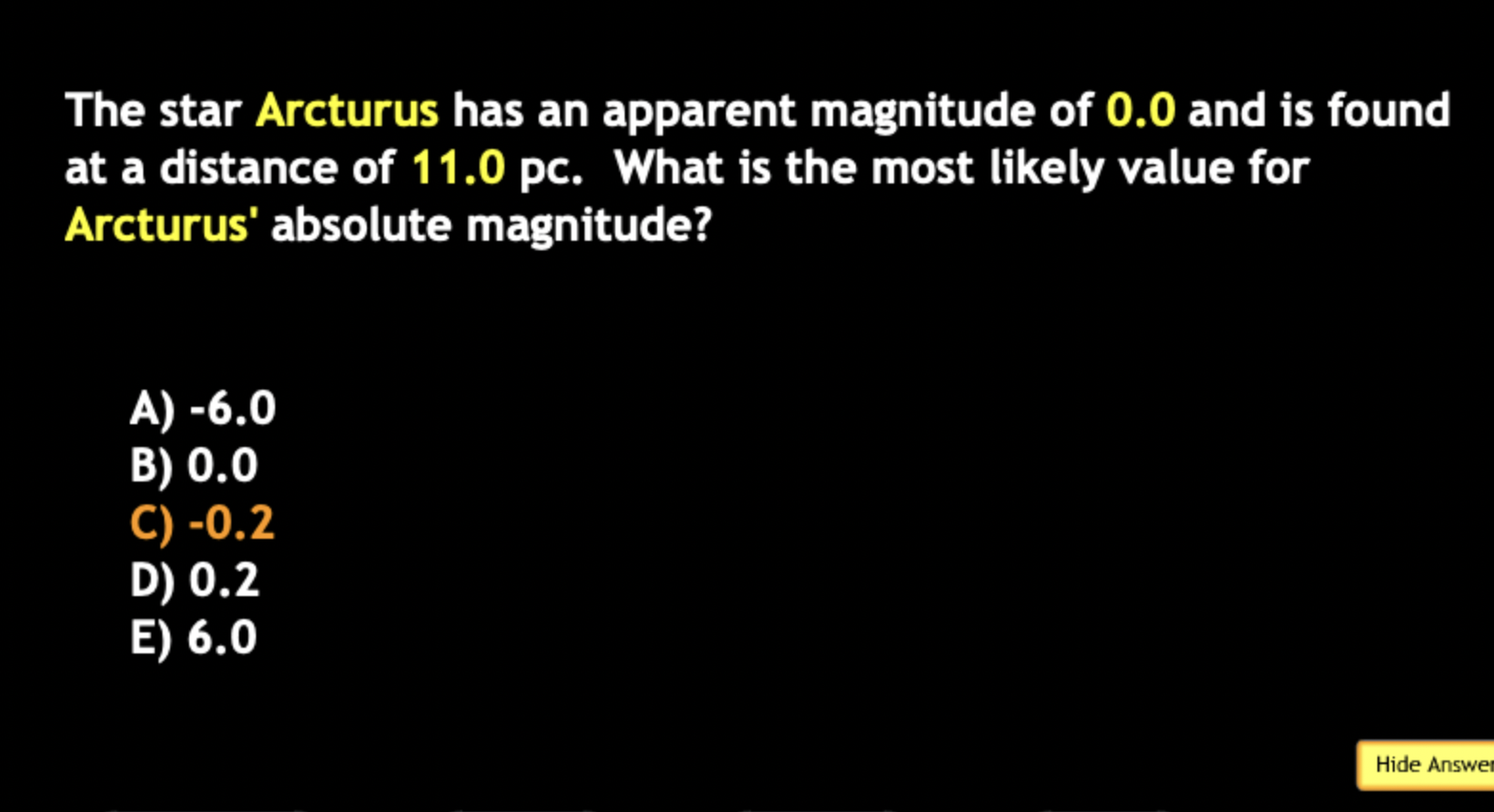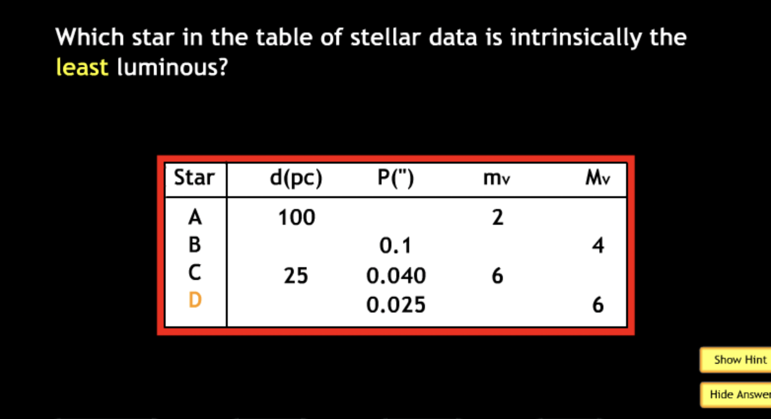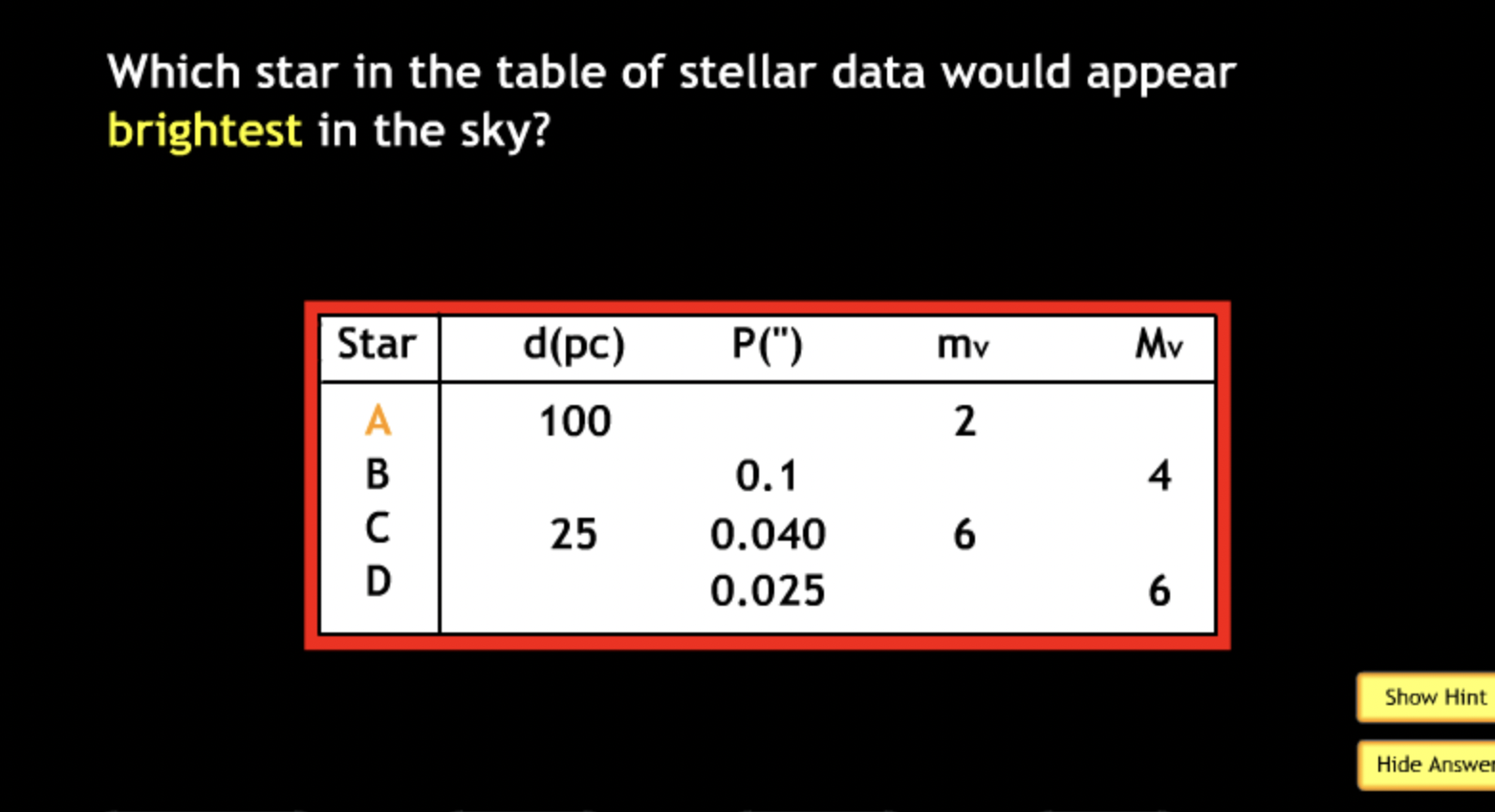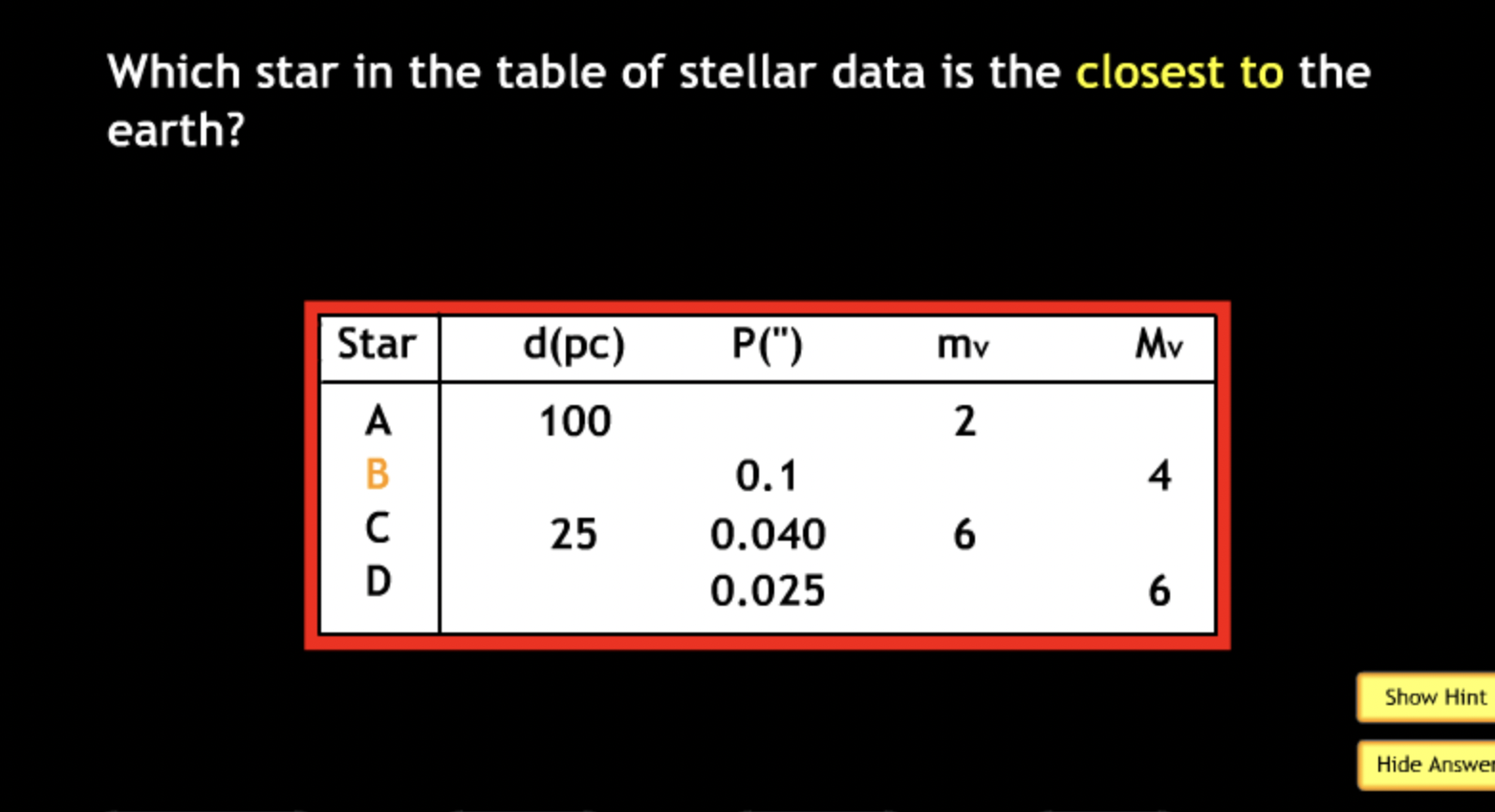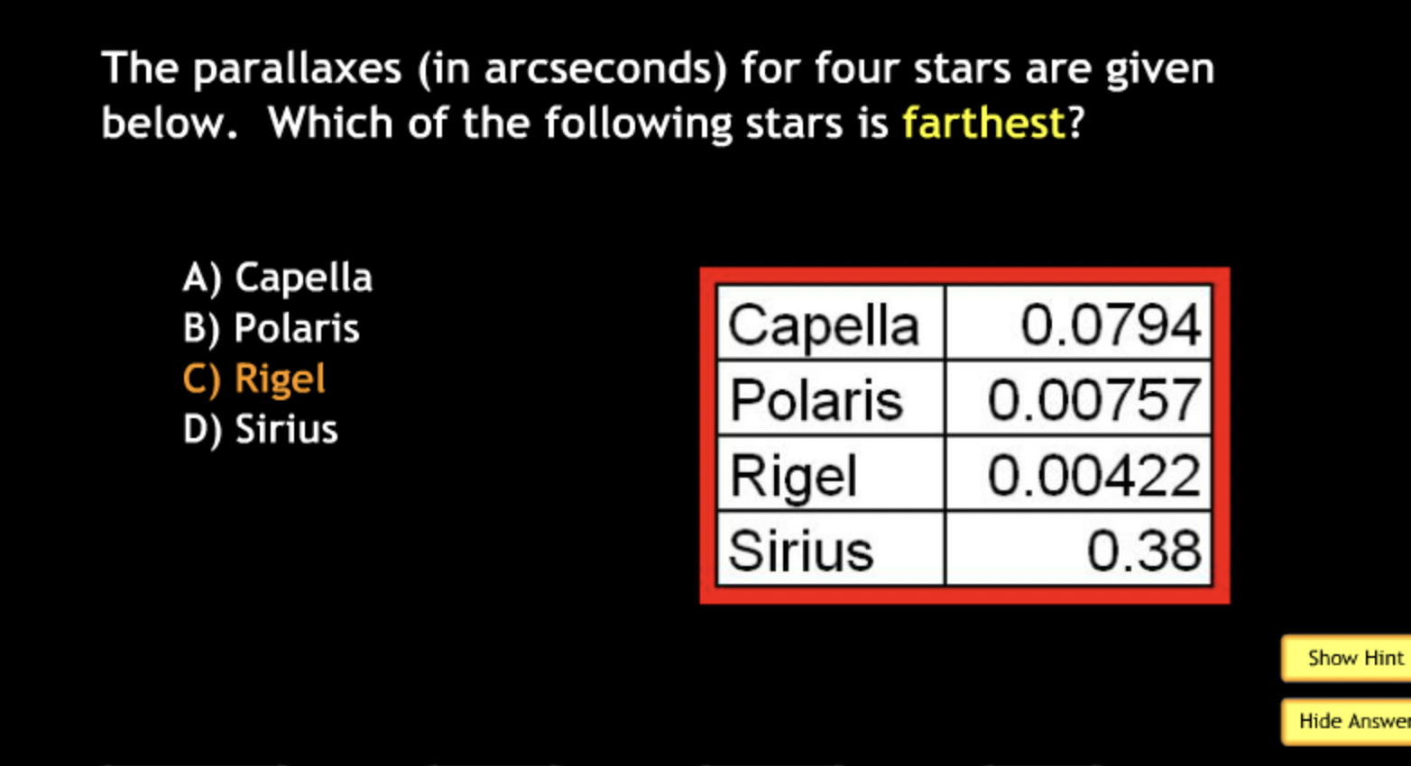 A star at a distance of 10 parsecs must have a parallax of… 0.1 arcseconds